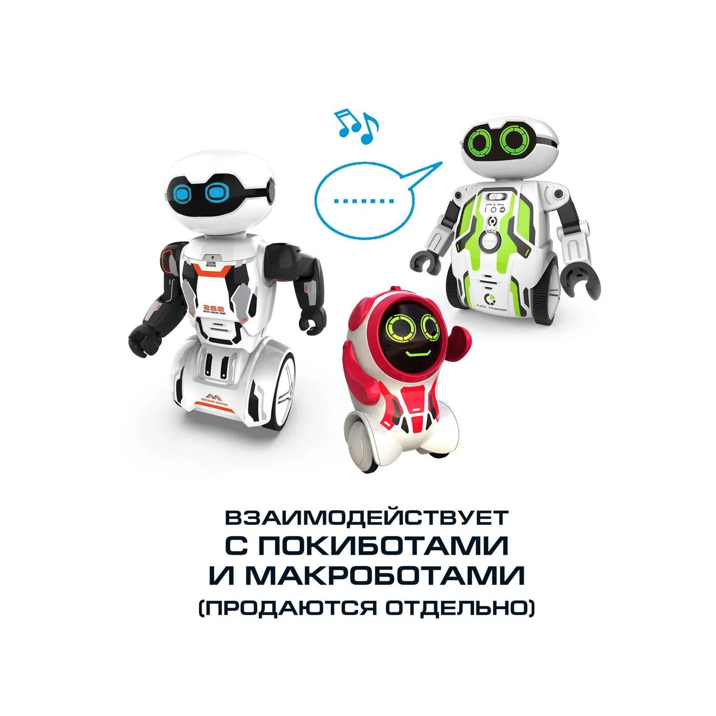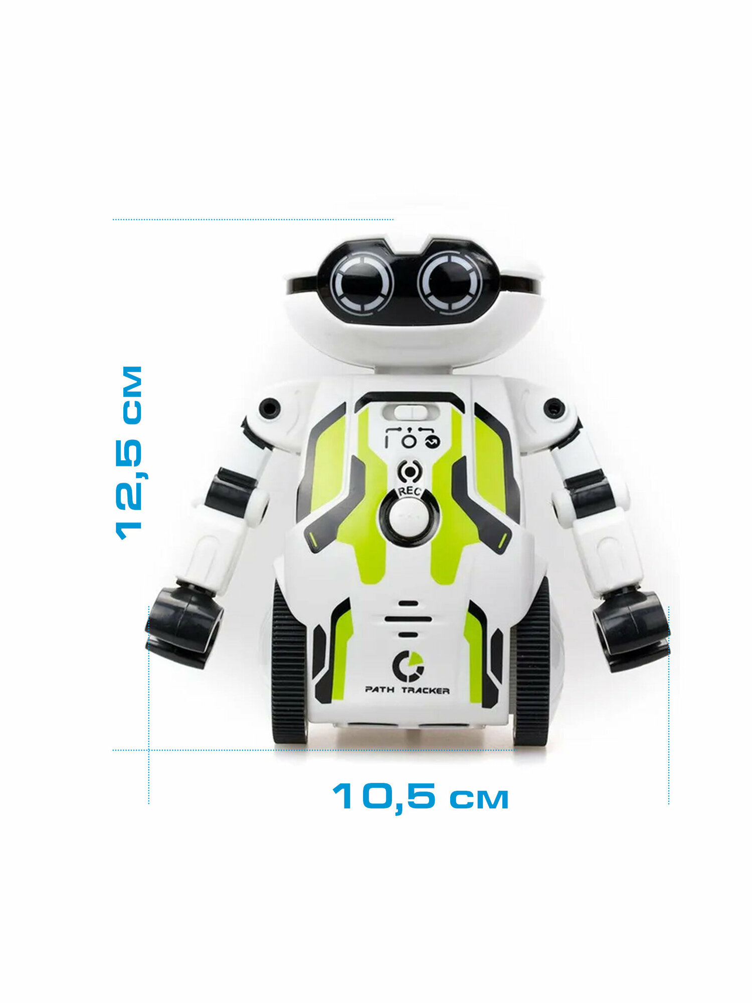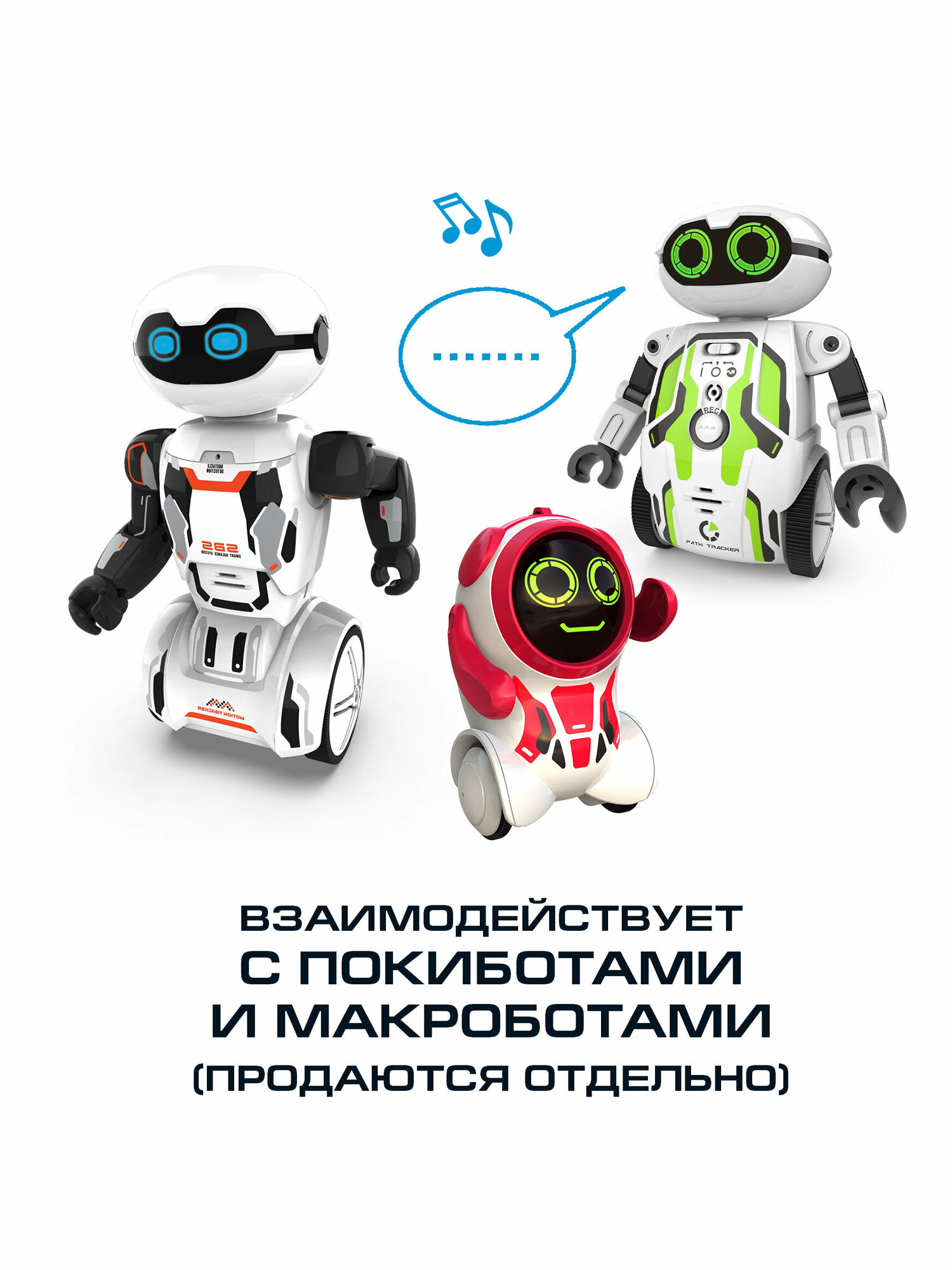 записывает и воспроизводит голос (память – на три звуковых варианта); реагирует на хлопки (произносит записанный текст, танцует); умеет двигаться по заданной линии, внутри лабиринта или замкнутых пространств, благодаря сенсорам движения; имеет светодиодную подсветку глаз; может взаимодействовать с другими роботами (Покиботом и Макроботом); дополнительно управляется с помощью бесплатного мобильного приложения; работает на батарейках (2 х ААА, в комплект не входят). Игрушка выполнена из качественного прочного пластика, имеет небольшие размеры – 6,5 x 7 x 12,5 см.