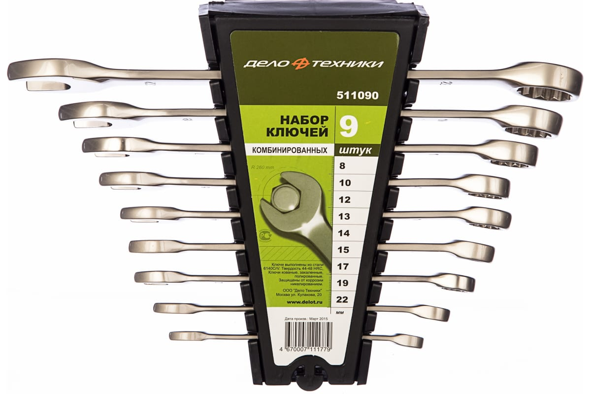 Набор из наиболее распространённых комбинированных гаечных ключей, с рожковым профилем на одной стороне и двенадцатигранным накидным профилем на другой.Классический вариант комбинированного гаечного ключа с рожковым профилем на одной стороне и двенадцатигранным накидным профилем на другой.Комбинированный ключ является самым распространенным вариантом гаечного ключа т.к. совмещает в себе возможности рожкового и накидного профилей.Накидной профиль отведён от продольной оси тела ключа на 15° это позволяет работать в ограниченном пространстве. Точность изготовления 12-гранного накидного профиля сводит к минимуму вероятность слизывания граней крепежа. Угол наклона рожковой части относительно продольной оси тела ключа — 15°, что позволяет довести минимальный угловой шаг при работе в труднодоступных местах до 30°. Ключи изготовлены из стали 6140CrV или аналогичной по характеристикам стали 31CrV3.Состав набора:— ключи комбинированные: 8, 10, 12, 13, 14, 15, 17, 19, 22 мм;— холдер.Сталь: 6140CrV (31CrV3)Твёрдость: 44—48 HRCНикелирование