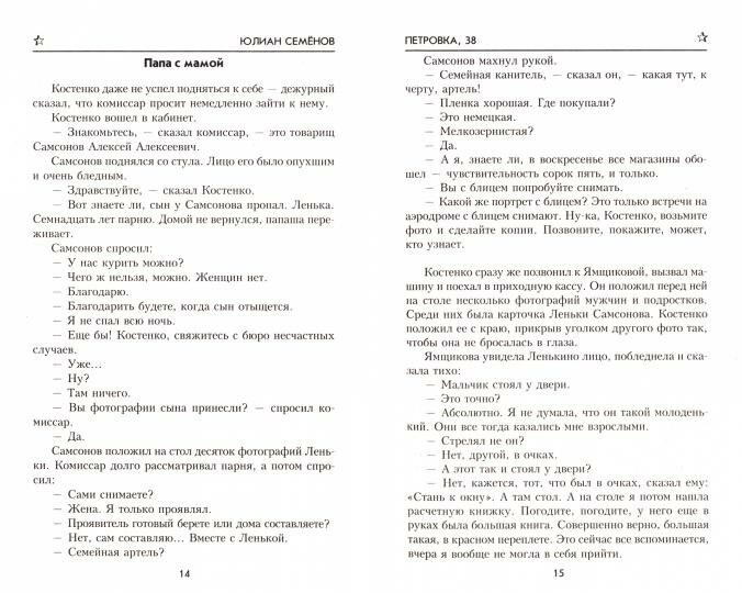 Книга Юлиана Семенова "Петровка 38" - это захватывающий детективный роман о трех сотрудниках милиции разных возрастов, расследующих дело о грабеже. Сюжет интересен и держит в напряжении, персонажи хорошо прорисованы и насыщены деталями. Книга "Огарева 6" тоже очень хороша. Сюжетные повороты неожиданные, а герои интересные и оригинальные.