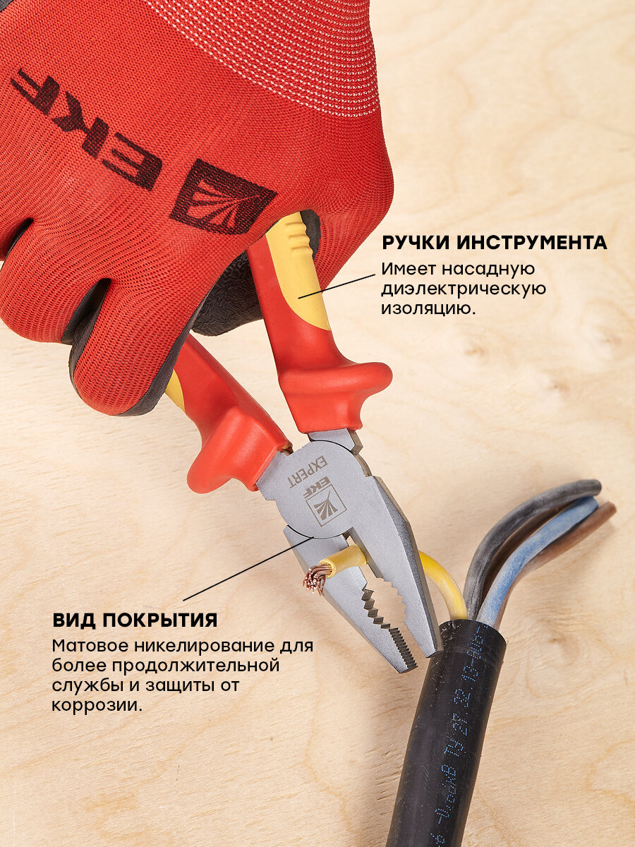 ОПИСАНИЕ. Диэлектрический шарнирно-губцевый инструмент – большая группа изделий, необходимых для проведения работ под напряжением до 1000 В. Инструмент серии Master имеет диэлектрическое покрытие (изоляцию), нанесенное методом погружения. Инструмент серии Expert имеет насадную диэлектрическую изоляцию с элементами защиты от соскальзывания. ПРЕИМУЩЕСТВА. Материал рабочей части: инструментальная хром-ванадиевая сталь. Поверхность: матовое никелирование. Режущие кромки дополнительно закалены токами высокой частоты HRC 62. Высококачественный материал и отличная эргономика рукояток. Упоры для защиты от соскальзывания, обеспечивают удобный хват и рычажное усилие, необходимое для осуществления реза. Expert – серия инструментов с улучшенными эксплуатационными характеристиками, которые проходят дополнительную обработку и контроль при производстве. Соответствие нормам IEC 60900:2004. ПРИМЕНЕНИЕ. • Пассатижи используют для захвата и удержания плоских и цилиндрических деталей, проводов и элементов крепежа. Наличие режущей кромки позволяет откусывать проволоку и зачищать провода. • Бокорезы предназначены для разрезания проволоки, проводов,гвоздей, прутьев. Различаются по форме и размеру рабочей части. • Кабельные ножницы применяют для резки медных или алюминиевых проводов/кабелей. • Длинногубцы/Длинногубцы изогнутые используются для захвата и удержания мелких элементов, проволоки, колец, винтиков и выполнения различных работ в труднодоступных местах. • Круглогубцы применяют для закручивания или выпрямления проволоки и тонких металлических изделий. • Клещи переставные предназначены захвата и опрессовки деталей, сгиба труб, демонтажа винтовых соединений и т. д.