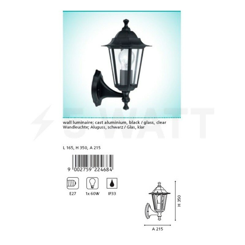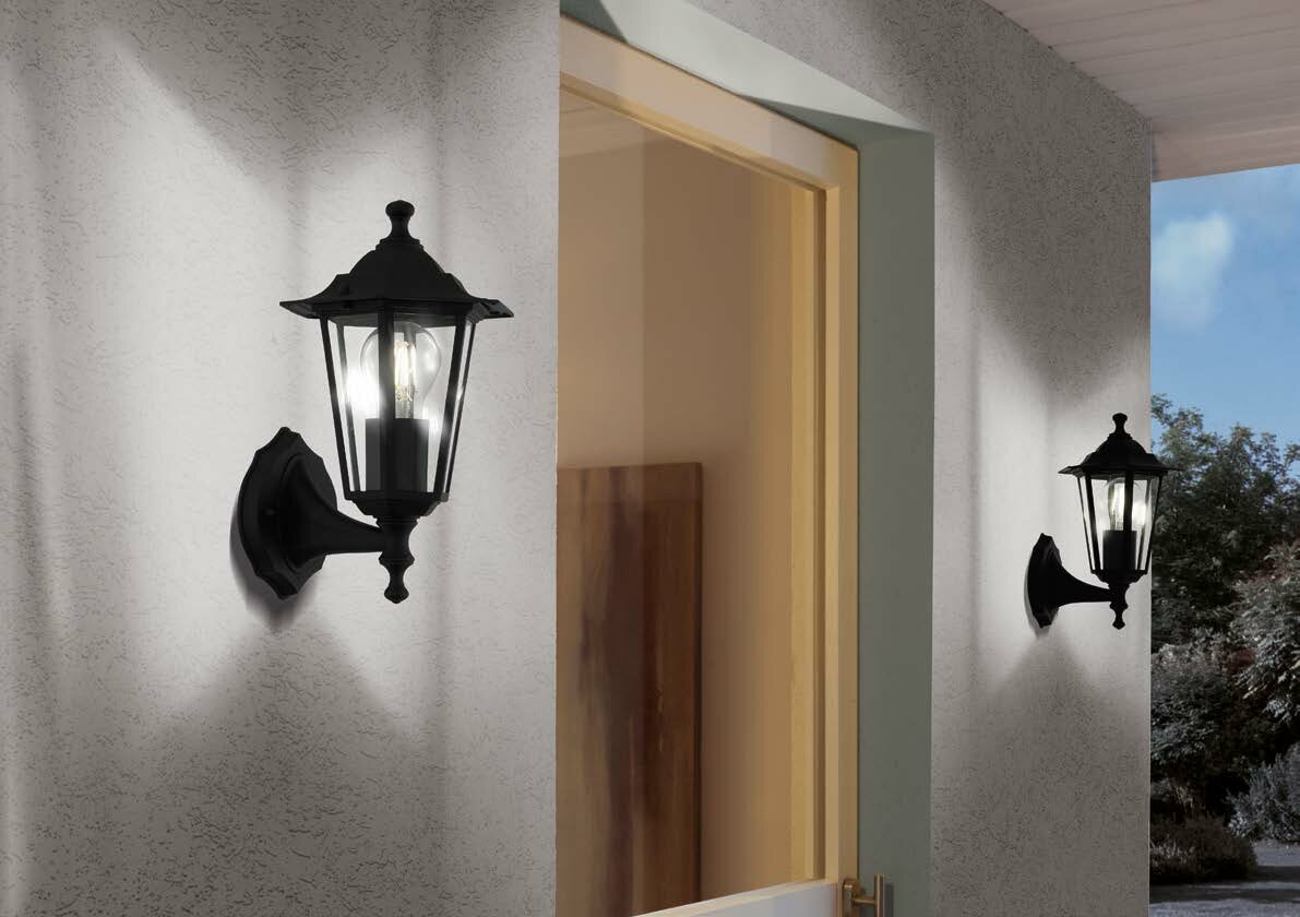 Настенный фонарь уличный Laterna - продукт известной компании Eglo (Австрия). Имеет максимальную мощность 60 Вт, освещает площадь до 3 кв. м. Отлично подойдет для таких мест, как дача, фасад, веранда и беседка. Впишется в интерьеры следующих стилей: классический, замковый.