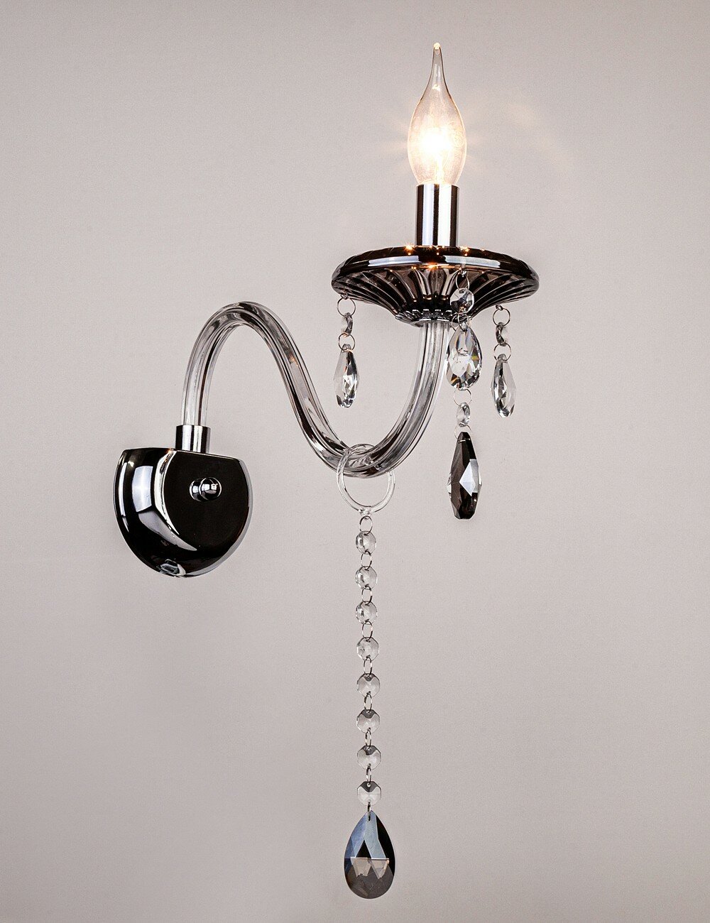 Бра выполнено из надежных и качественных материалов и прослужит не один год. Его конструкция лаконично дополнена изящными и воздушными подвесками из дымчатого хрусталя. Устройство предусматривает использование одной лампы (не входит в комплект) максимальной мощностью 60 Вт и способно наполнить комнату площадью 4 кв. м приятным мягким светом.