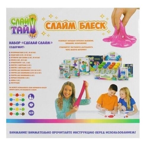 Набор для самостоятельного создания блестящего слайма. В наборе есть все ингредиенты для смешивания и подробная инструкция.