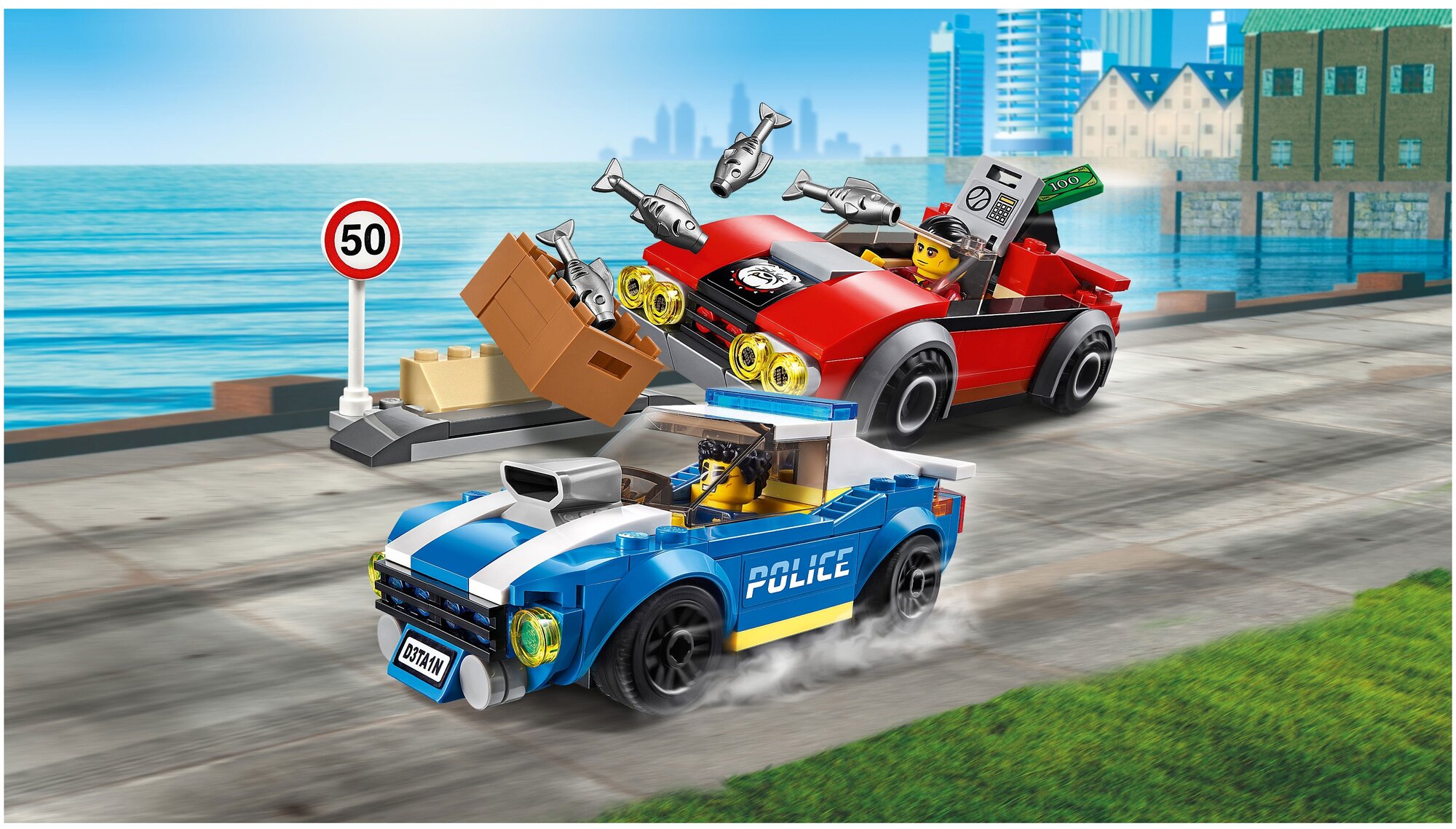 - Минифигурки героя телесериала «Лего Сити: приключения», лейтенанта Дюка ДеТэйна, и воришки Вито, крутой полицейский автомобиль, спортивный автомобиль воришек, украденный сейф и тележка с рыбой просто созданы для веселья и увлекательных полицейских погонь!