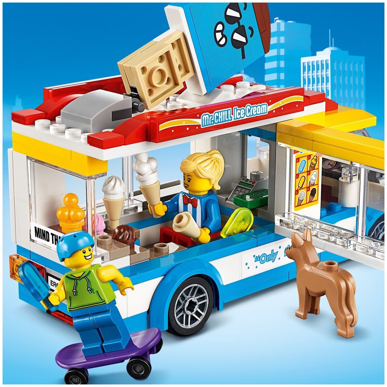 - Конструктор для детей, включающий в себя ярко раскрашенный грузовик с мороженым, минифигурку мороженщицы и минифигурки скейтбордистов, а также фигурку милого пса. Идеально подходит для самостоятельных творческих игр.