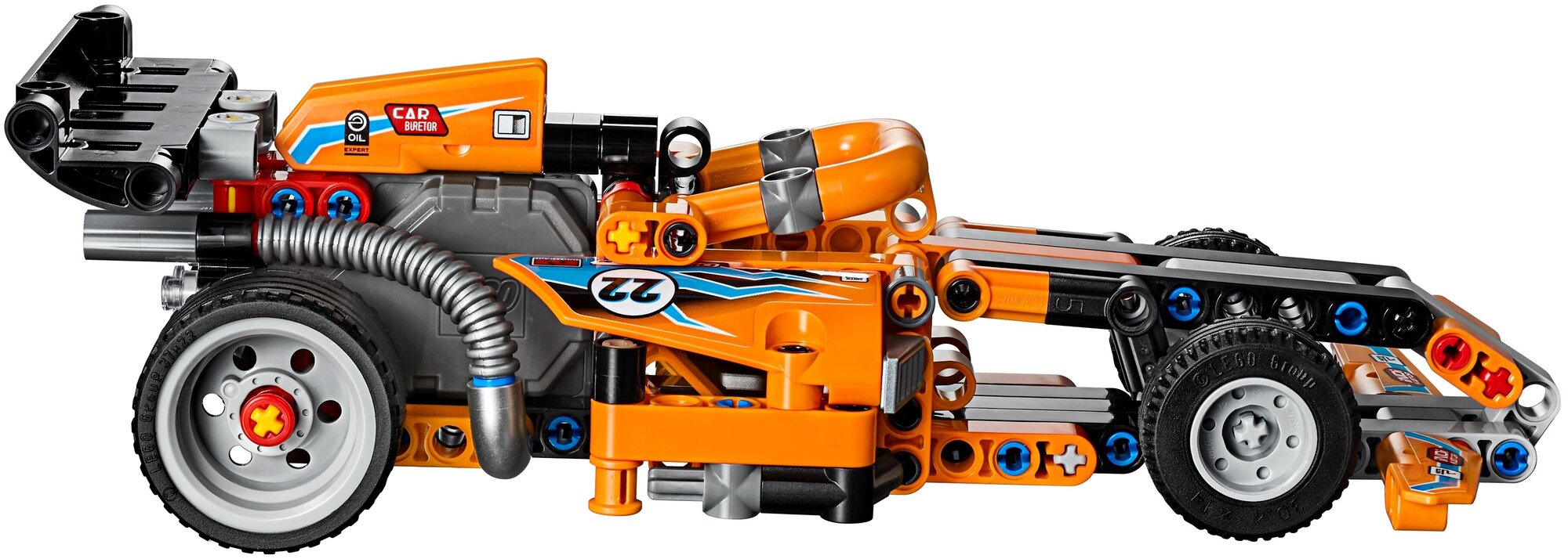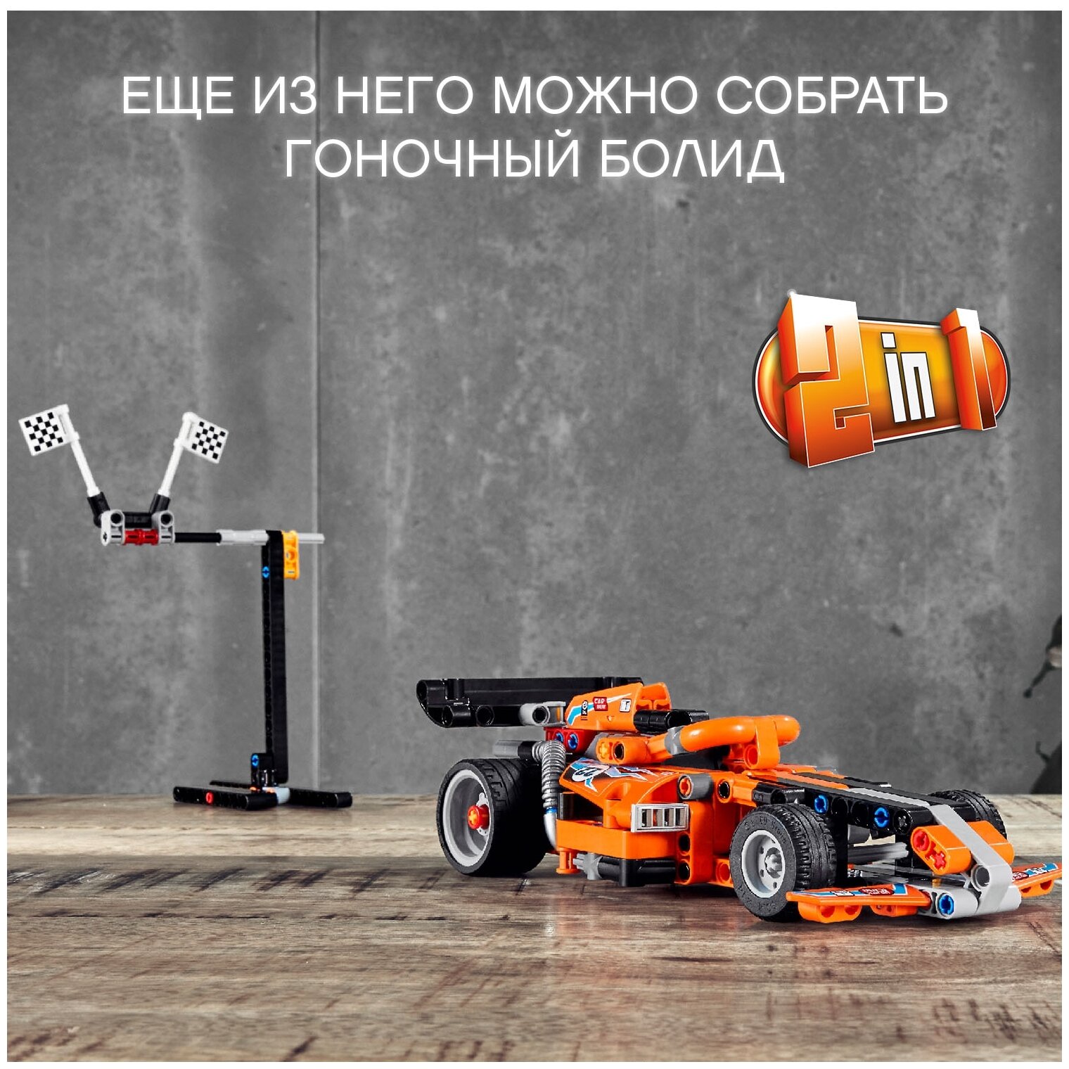 Мчись на огромной скорости и выигрывай гонки на этом потрясающем Гоночном грузовике. Яркие цвета и наклейки сделают его самым заметным автомобилем в день гонок. Откати грузовик назад и отпусти, чтобы увидеть, как быстро он едет к финишу. Этот потрясающий грузовик с гигантской выхлопной трубой и огромным спойлером выглядит почти, как настоящий. Хочешь узнать больше? Классные новости! Этот игрушечный грузовик LEGO® Technic можно перестроить в гоночный автомобиль.