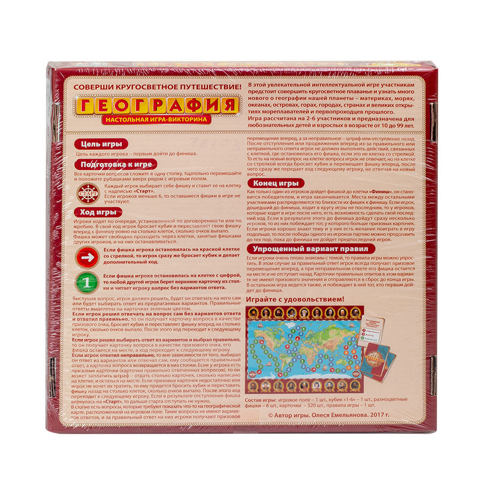 Для всех любителей географии и путешествий — новая игра-викторина «География».Бросайте кубик, отвечайте на вопросы с карточек, выигрывайте и совершите кругосветное путешествие!Состав игры:— картонное игровое поле (41х32 см.),— игральный кубик (1 шт.),— фишки (6 шт.),— карточки (6,5х4,5 см.) — 320 шт.Игра предназначена для детей от 10 лет и рассчитана на 2-6 игроков.Викторина развивает интеллект, любознательность и расширяет кругозор.Автор игры: Олеся Емельянова