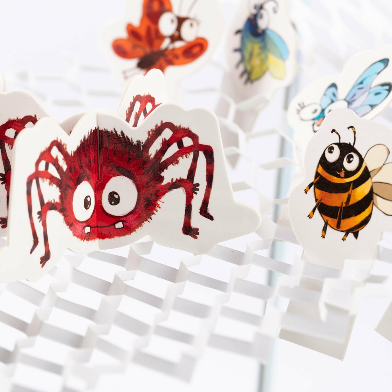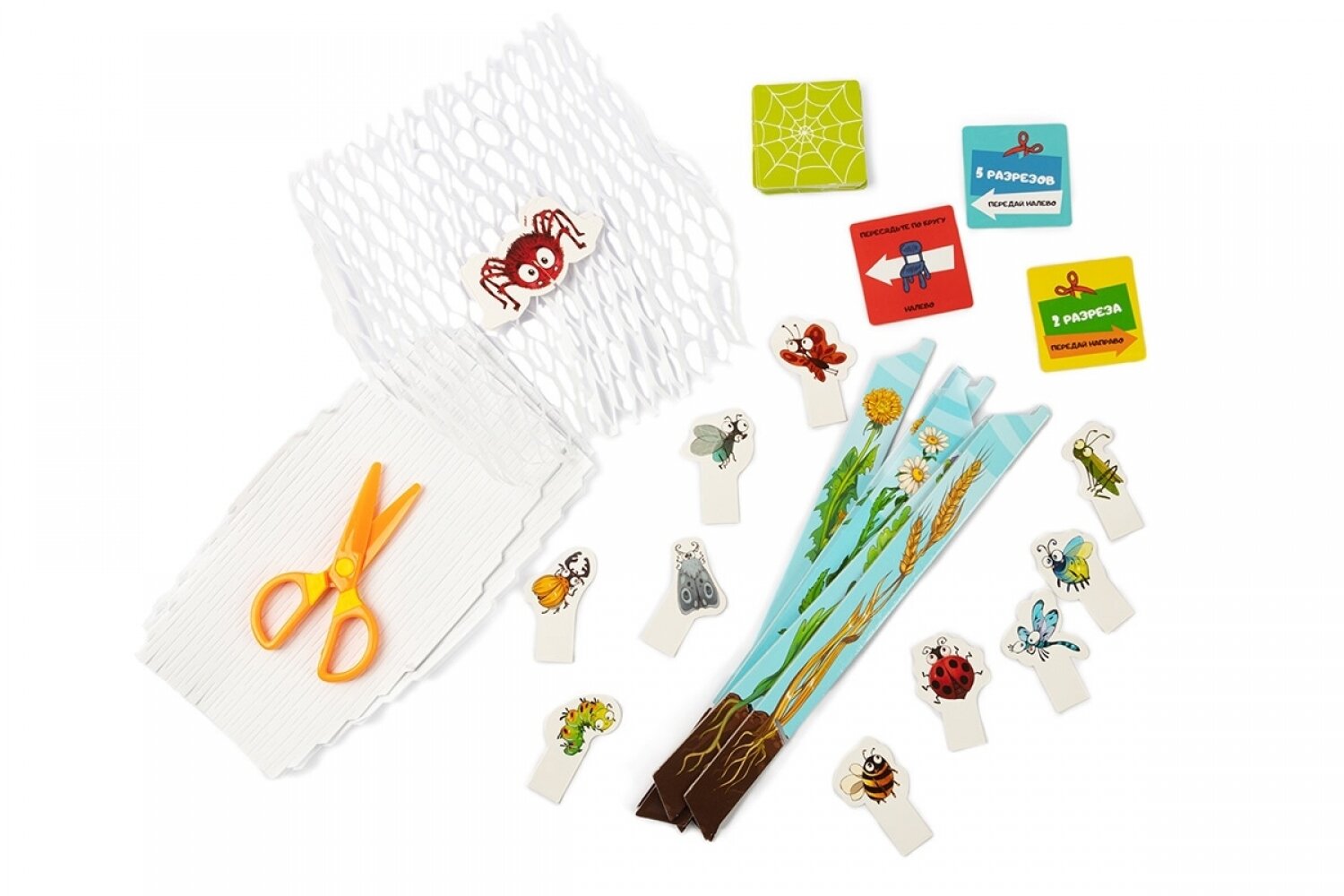 Перед вами небольшая зеленая полянка, на которой трудолюбивый паучок сплел красивую паутинку. Вот только маленькие букашки, весело игравшие на полянке, запутались в ней Не беда! С вашей помощью все букашки спрыгнут на травку и продолжат свою игру. Достаньте из коробки паутинки и цветы - опоры, натяните паутинку и разместите на ней паучка и 10 букашек. По очереди делайте разрезы ножницами, чтобы освободить всех жучков. Осторожно, сам паучок должен оставаться на паутинке! Как только все букашки свободны — вы все вместе выигрываете!