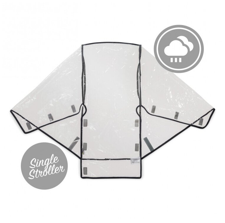 Он изготовлен из полимерных материалов, поэтому не мешает малышу знакомиться с окружающим миром. Дождевик быстро и легко накидывается на коляску и обеспечивает защиту ребенку в непогоду. Дождевик для 3-колесных колясок.