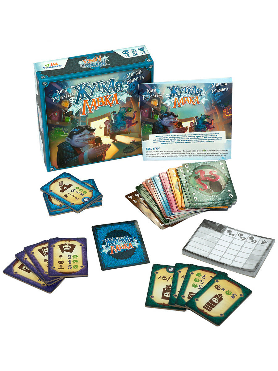Смерть ей к лицуОдин игрок становится лавочником, а остальные - помещиками. Ваша задача - выполнять различные задания, обмениваясь пугалками с лавкой. Есть два способа получить желаемое. Первый - "выгодная сделка", когда игрок обменивает определенное количество карт с одинаковым номиналом на такое же количество других карт. Второй - "продажа по сходной цене", в рамках которой вы меняете карты с определенным номиналом на карты, сумма которых будет такой же. Например, разбиваете карту с номиналом 10 на пять карт с номиналом 2. Как-то так.