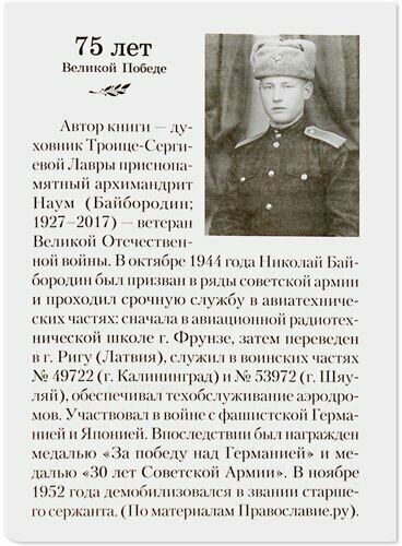 Эту книгу написал известный в России и за ее пределами Лаврский старец архимандрит Наум (Байбородин; 1927-2017). Батюшка рассказал в ней о защитнике нашего Отечества в Великую Отечественную войну - маршале А.М. Василевском. Маршалу Александру Михайловичу Василевскому было суждено войти в историю Великой Отечественной войны единственным полководцем, который не потерпел ни одного поражения. Александр Михайлович не приписывал победы только собственным усилиям и усилиям солдат и офицеров. Он говорил, что на помощь русскому воинству не раз приходили святые вместе с Пресвятой Богородицей, защищая многострадальную Русь Небесным покровом.