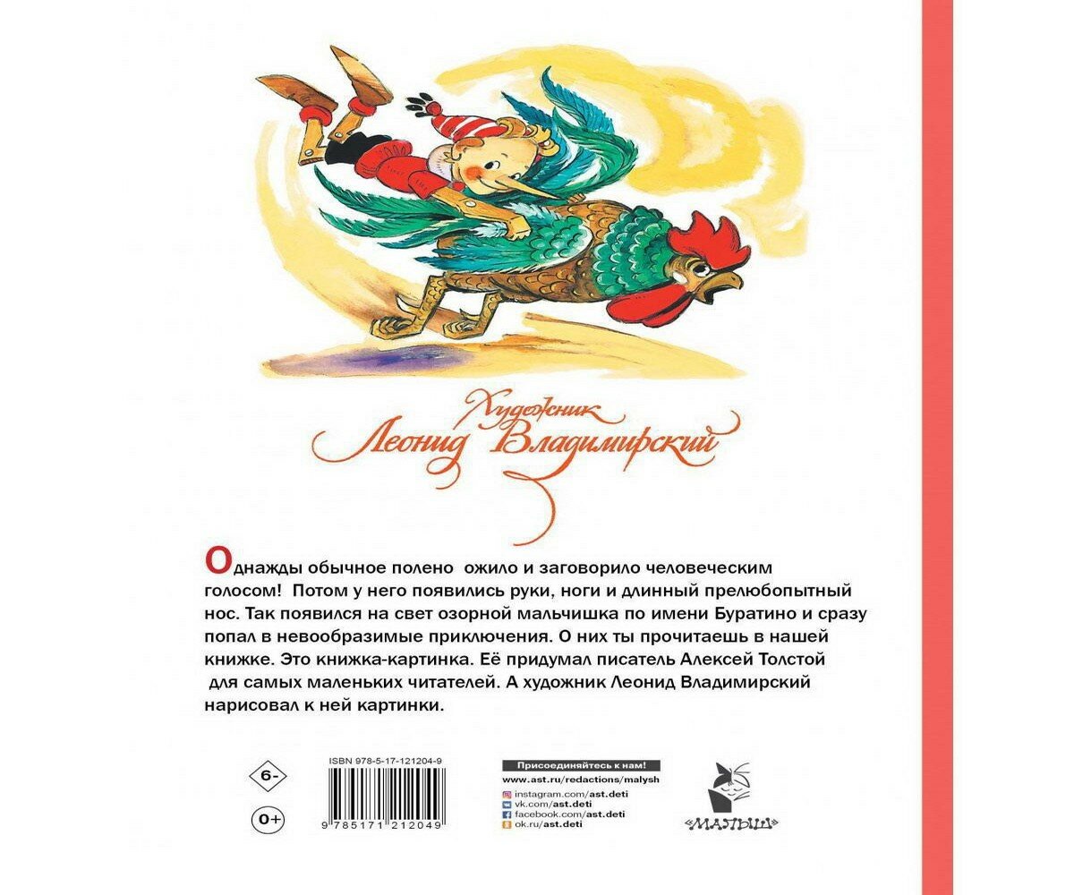 Книгу "Приключения Буратино, или Золотой ключик" Алексей Николаевич Толстой придумал специально для малышей. Художник Леонид Владимирский нарисовал к ней иллюстрации. В ней большие картинки и самые интересные приключения весёлого Буратино.