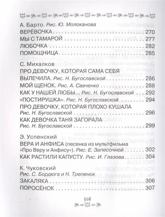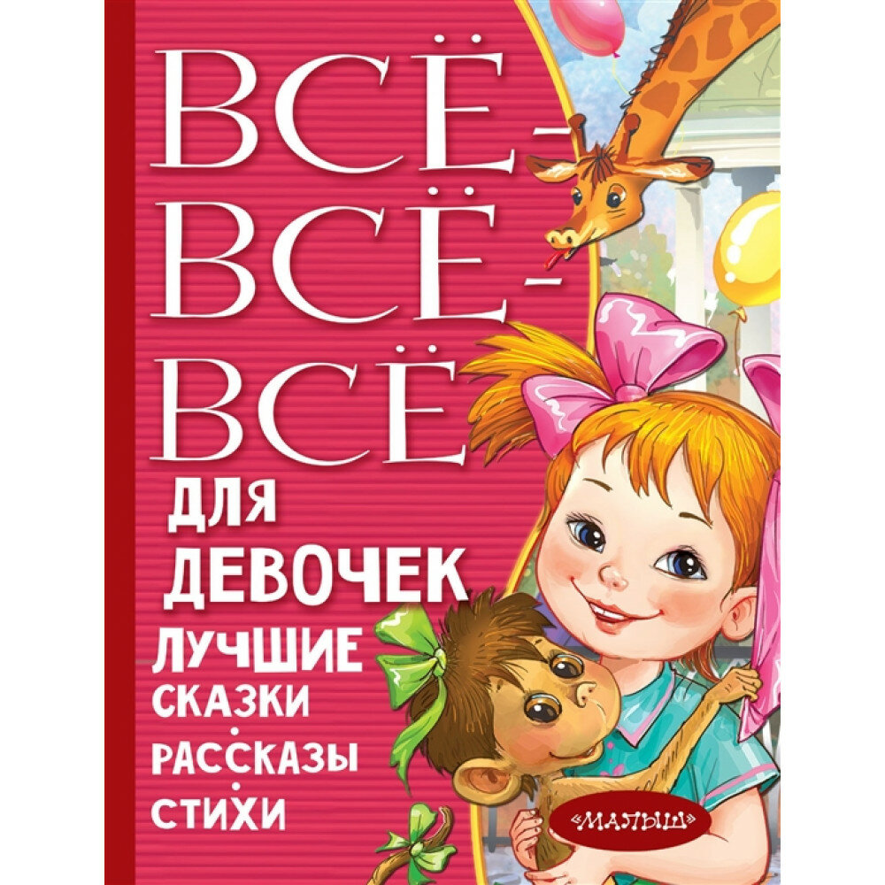 Книгу издательства "Малыш"Все-все-всё для девочек.Лучшие сказки, рассказы, стихи"купила после такой же книги для мальчиков. Книга для мальчиков очень понравилась девятилетнему внуку.Читали по очереди-внук выбирал для себя стихи, а мне досталось рассказы и сказки. Обе книги написаны крупным шрифтом на газетой бумаге, иллюстрации черно-белые. Внучкам еще 4,5года и они сами еще не читают, по этому оценить размер шрифта они не смогли, а вот черно-белые иллюстрации их не впечатлили. Однако в последнее время у девочек проснулся интерес к стихам, а их в книге достаточно много:С.Маршака,А.Барто,С.Михалкова и других авторов. При чем стихи для нас еще не известные, не знакомые по книжкам для малышей.По этому будем читать!
