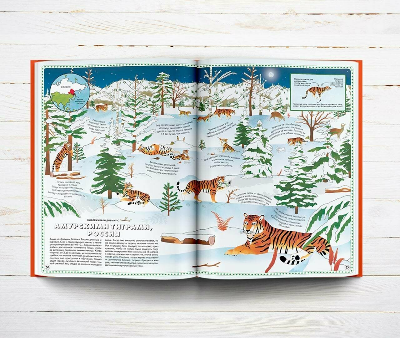 Этот атлас приглашает ребенка в удивительное путешествие по континентам Земли. На каждом материке читателя ждут приключения. Амурские тигры пригласят его на охоту, гигантские антарктические кальмары покажут, как обороняться от клыкачей, а большая панда расскажет, зачем ей лазать на неприступные горы. Книга полна красочных иллюстраций, поэтому атлас понравится даже самым маленьким любителям природы. Компактные тексты рассказывают только самое интересное и полезное о разных животных. Это универсальный подарок, который подойдет каждому. Атлас прекрасно развивает интеллект и учит внимательно относиться к природе и экосистемам Земли. Для детей 5-9 лет.