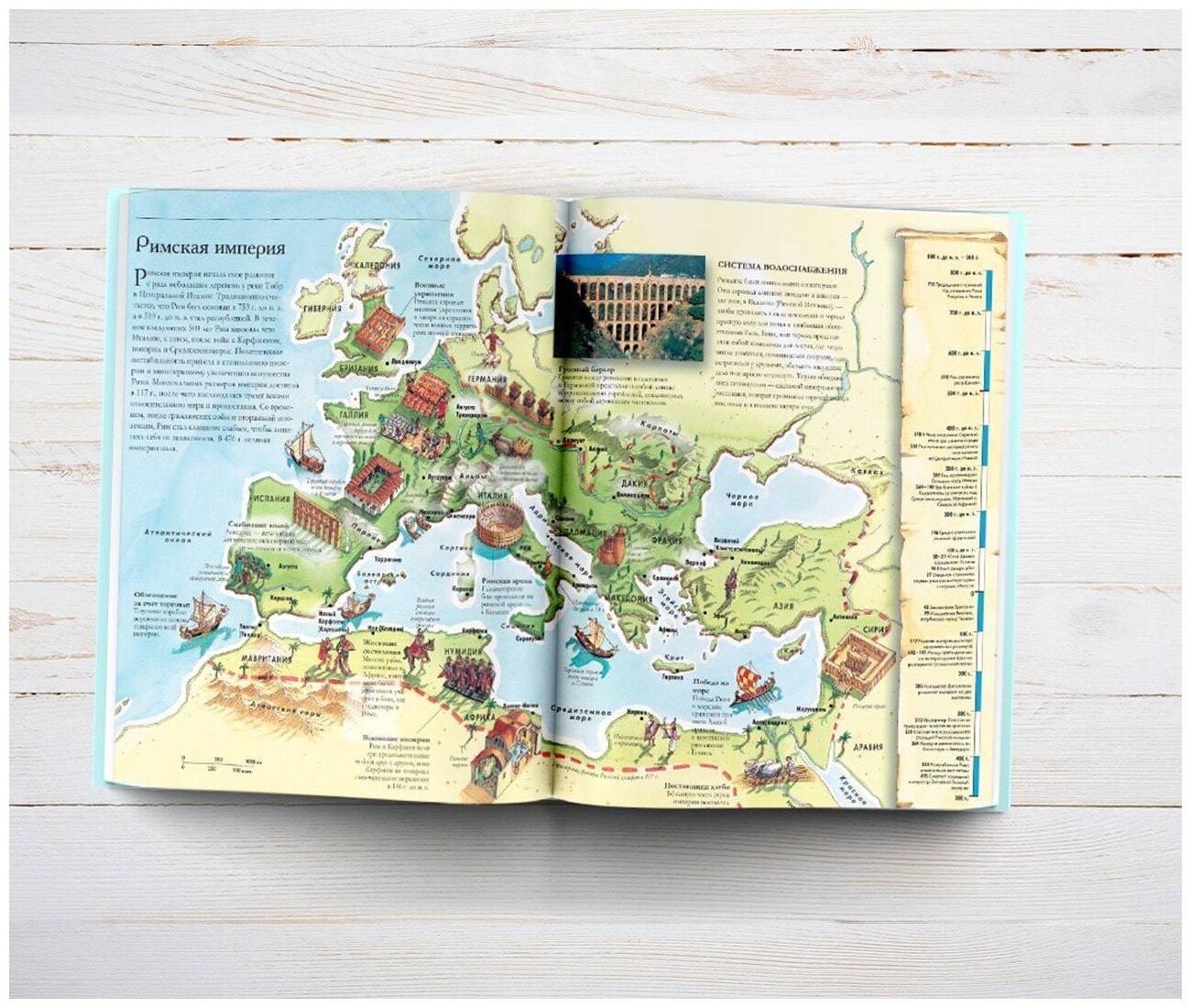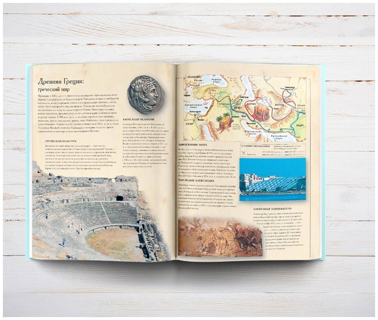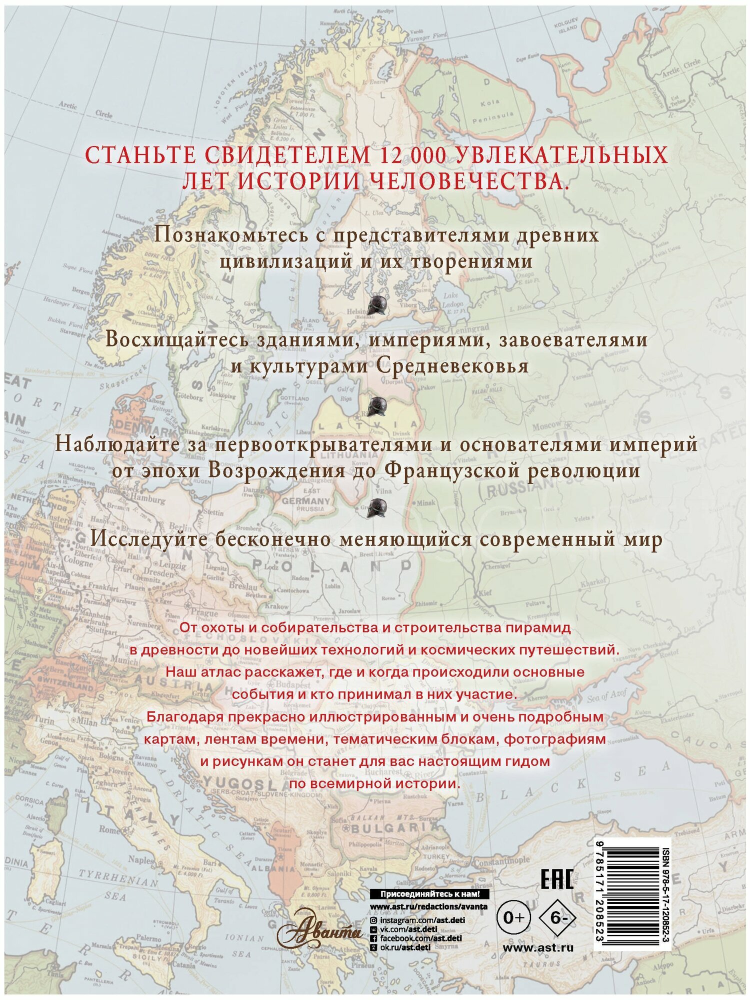 Этот атлас — настоящий гид по всемирной истории. Благодаря прекрасно иллюстрированным, подробным картам, лентам времени по каждому периоду, тематическим блокам, фотографиям и рисункам вы будете перемещаться во времени и пространстве: от древнейших цивилизаций до современных государств, из Новой Зеландии в Африку и на Аляску.