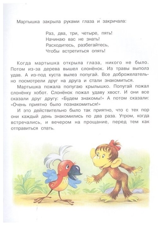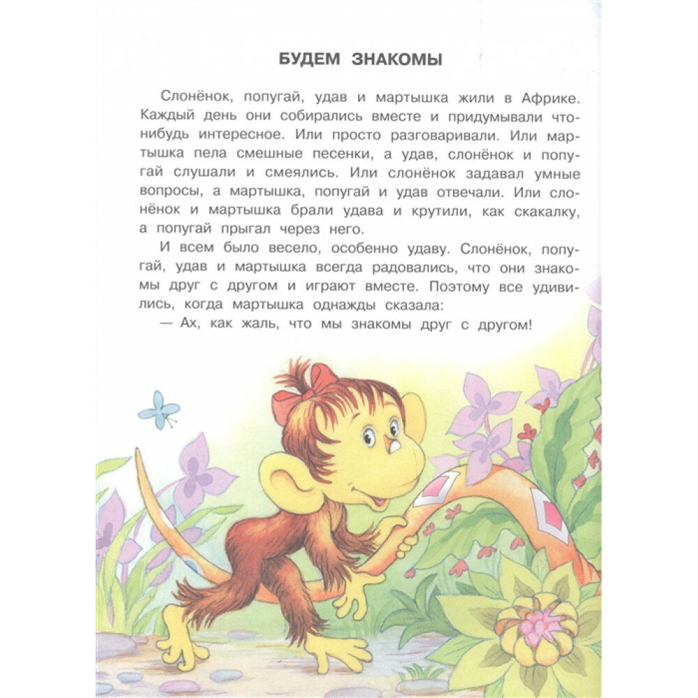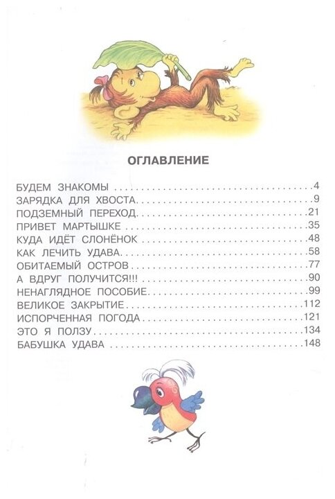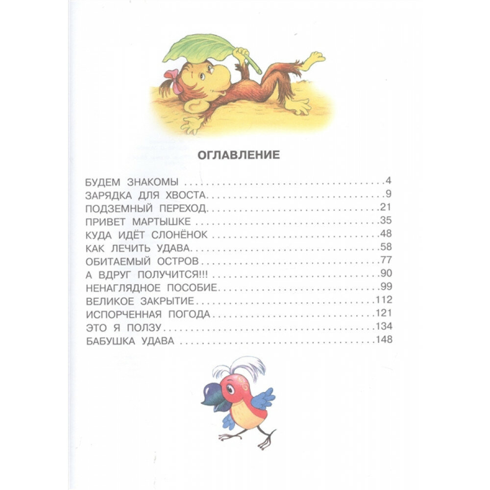 Главная задача героини этой сказки мартышки - не давать задумываться склонным к философии друзьям - удаву, слонёнку и попугаю. Если бы она их не тормошила с утра до вечера, жизнь в Африке показалась бы им не такой интересной. И у попугая есть своя задача - он постоянно ставит перед своей компанией неразрешимые задачи. А потом все вместе, мартышка, удав, слонёнок и попугай, их решают. Получается весёлая игра "в проблемы".