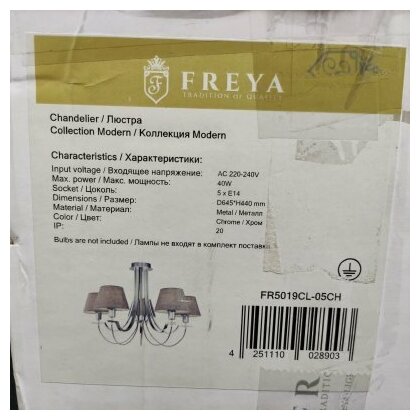 Потолочная люстра Felisa FR5019CL-05CH - продукт известной компании Freya (Германия). Имеет максимальную мощность 200 Вт, освещает площадь до 10 кв. м. Отлично подойдет для таких мест, как гостиная, спальня, кухня, кабинет, офис. Впишется в интерьеры следующих стилей: современный, модерн.