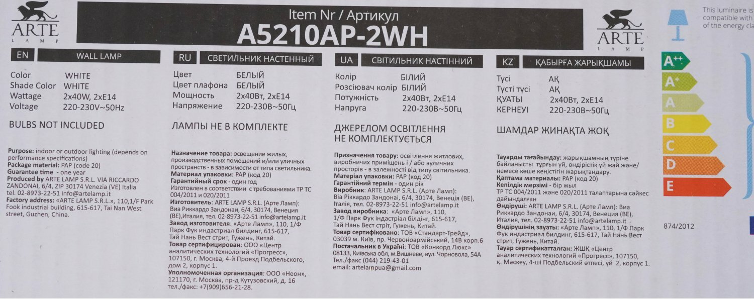 На сегодняшний день товар «Светильник для ванной ARTE LAMP Aqua-bara 9x32x9 см белый Artelamp Aqua-bara A5210AP-2WH» можно купить с кешбеком в 1 магазине: Яндекс.Маркет
