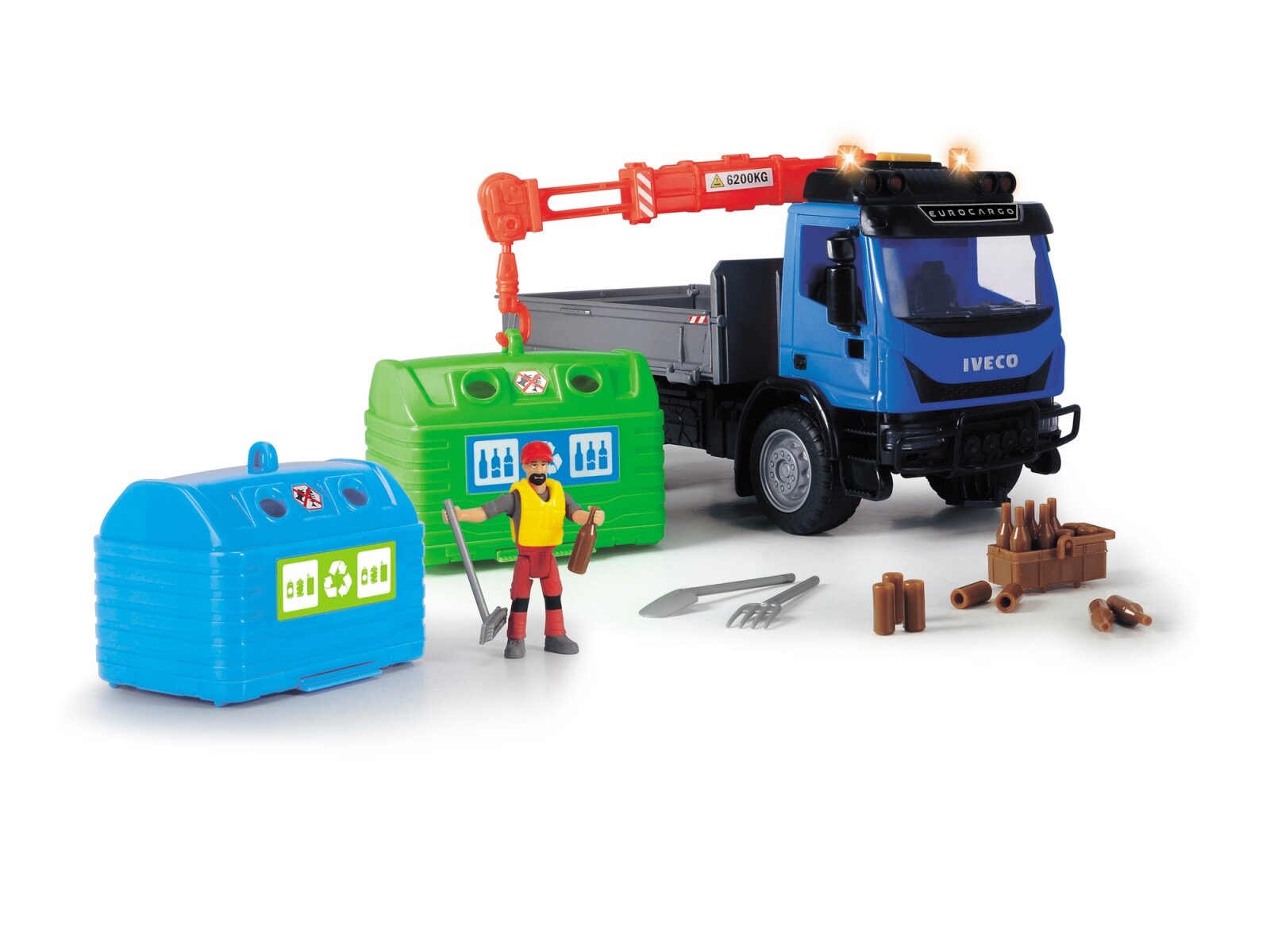Новая городская линейка! Автокран Iveco Eurocargo 25 см с подвижным краном, световые и звуковые функции, свободный ход, 2 мусорных распределительных контейнера для стеклотары, аксессуары, фигурка с подвижными частями тела, шлем, жилет.