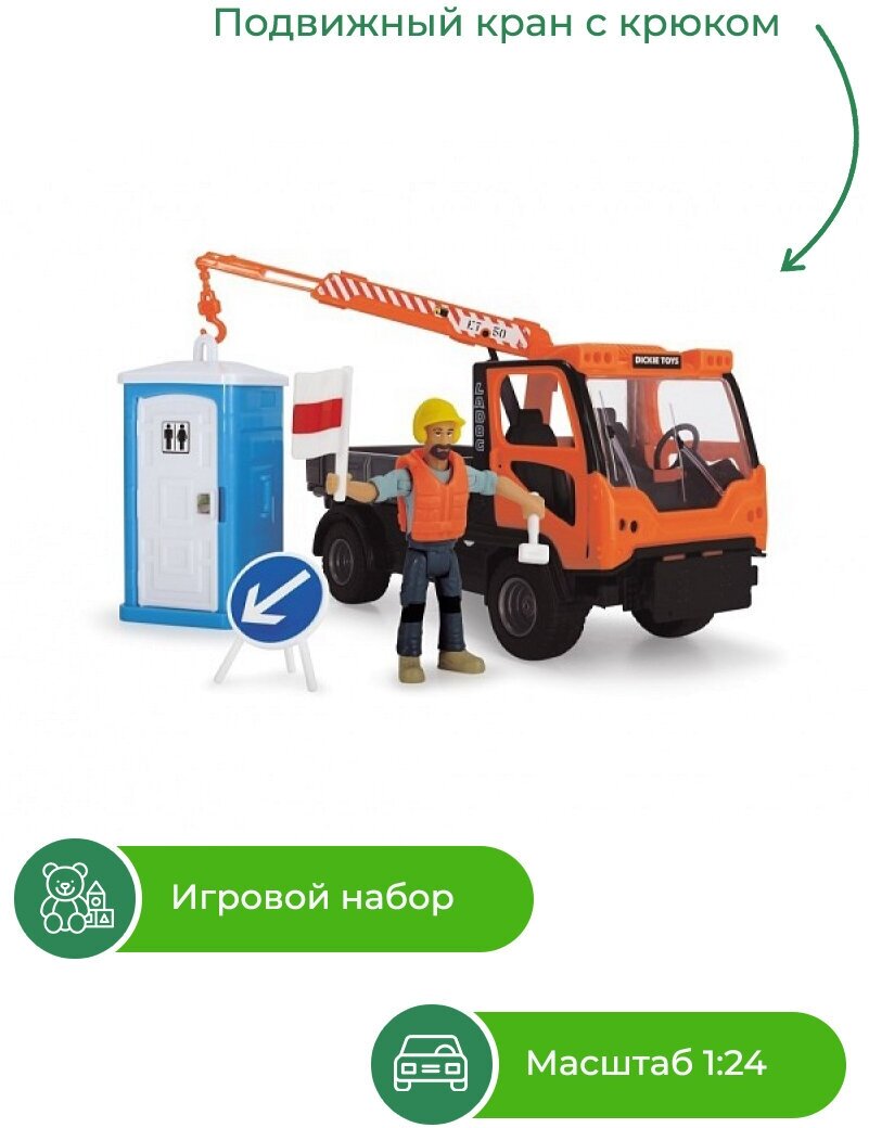 Стрела крана, платформа и боковые стенки автомобиля являются подвижными, а фигурку можно одеть в шлем и жилет.