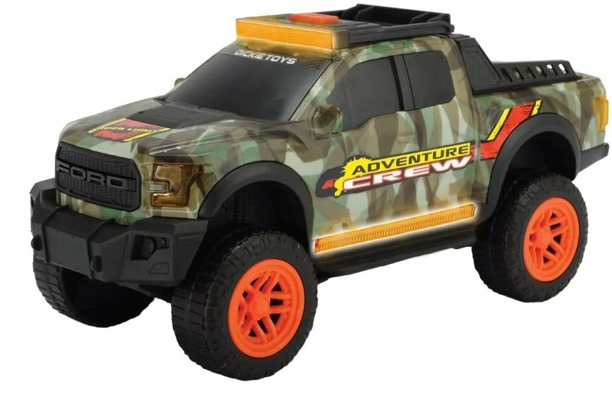 Эта игрушечная версия знаменитого Ford F150 Pick Up Truck несколько опережает оригинал. Изюминкой машинки являются световые и звуковые эффекты: гудок, звуки двигателя и даже музыка. С новым разработанным методом нанесения цвета на кузов, Dickie Toys обеспечил индивидуальный дизайн каждой модели кузова. Благодаря своему классному камуфляжному образу Ford F150 Raptor превратит комнату ваших детей в пейзаж, полный приключений!