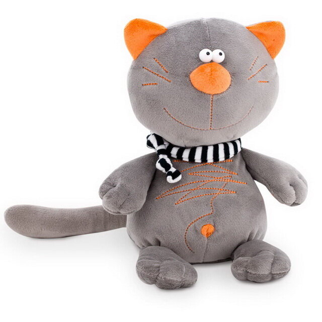 Кот Батон — очаровательный весельчак, с которым не хочется расставаться ни минуту! У котика серая, очень мягкая и приятная на ощупь шёрстка, оранжевые ушки и нос. На шее у симпатяги повязан шарф в стильную черно-белую полоску. Высота игрушки составляет 40 см. Верх изделия изготовлен из искусственного меха, фурнитура выполнена из пластмассы, набивка сделана из полиэфирного волокна и полиэтиленовых гранул. Рекомендованный возраст: 3 года +
