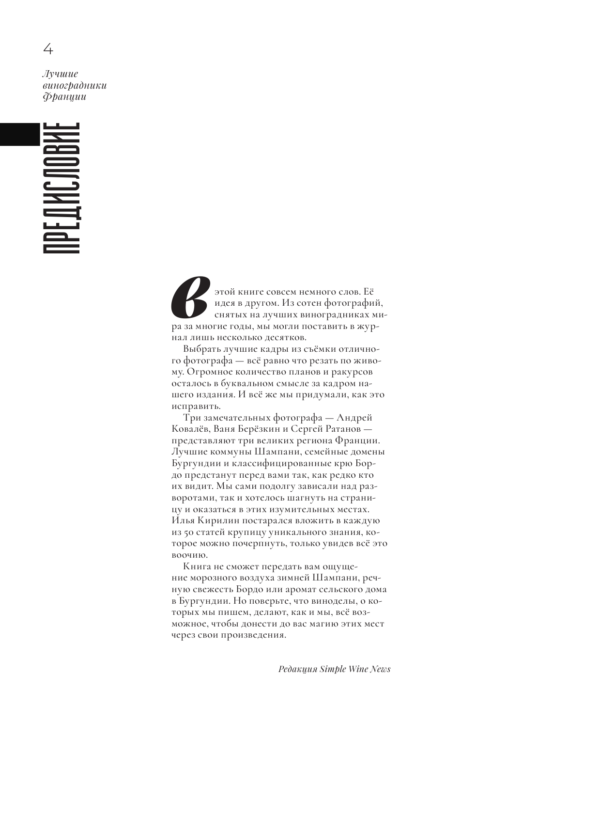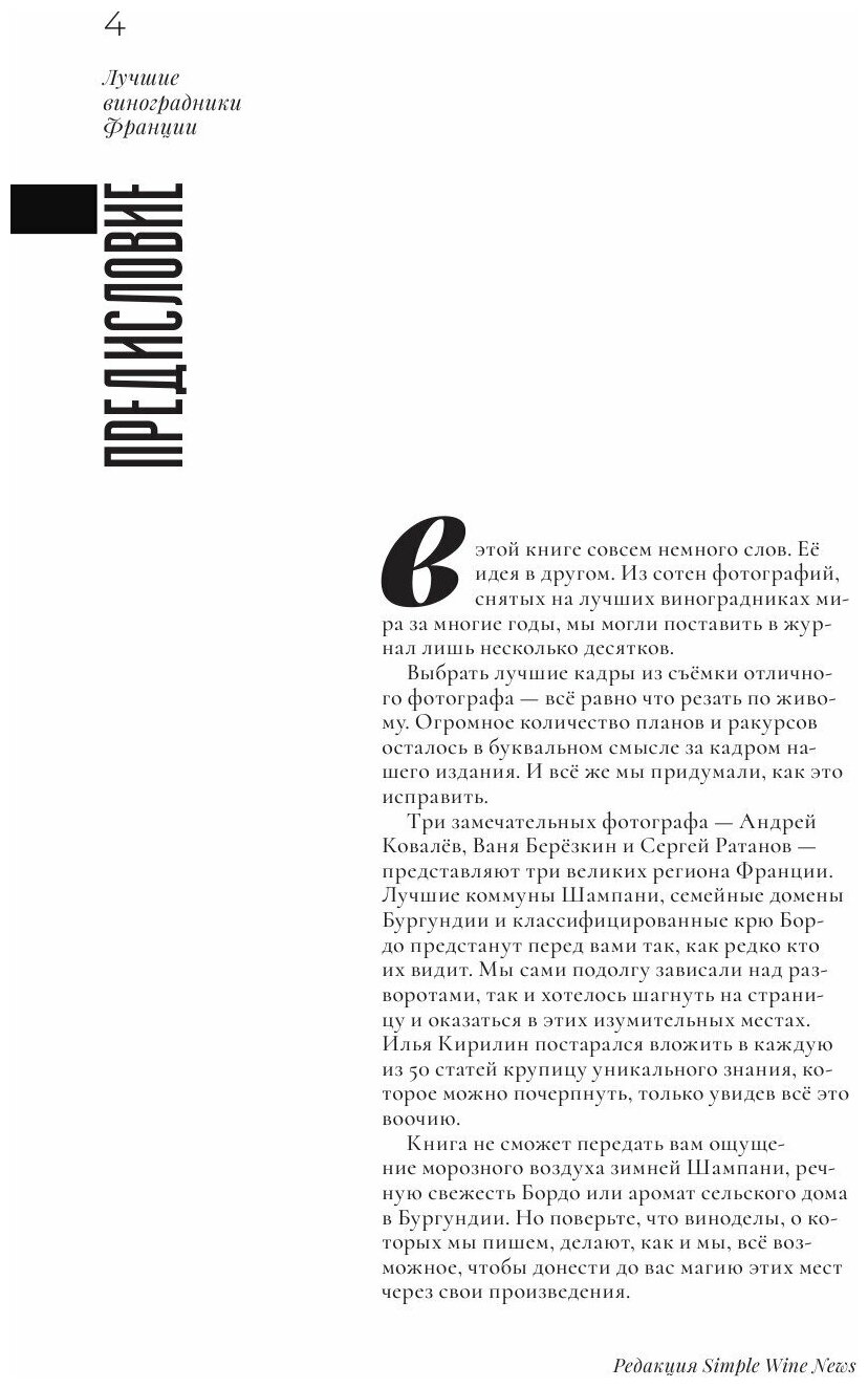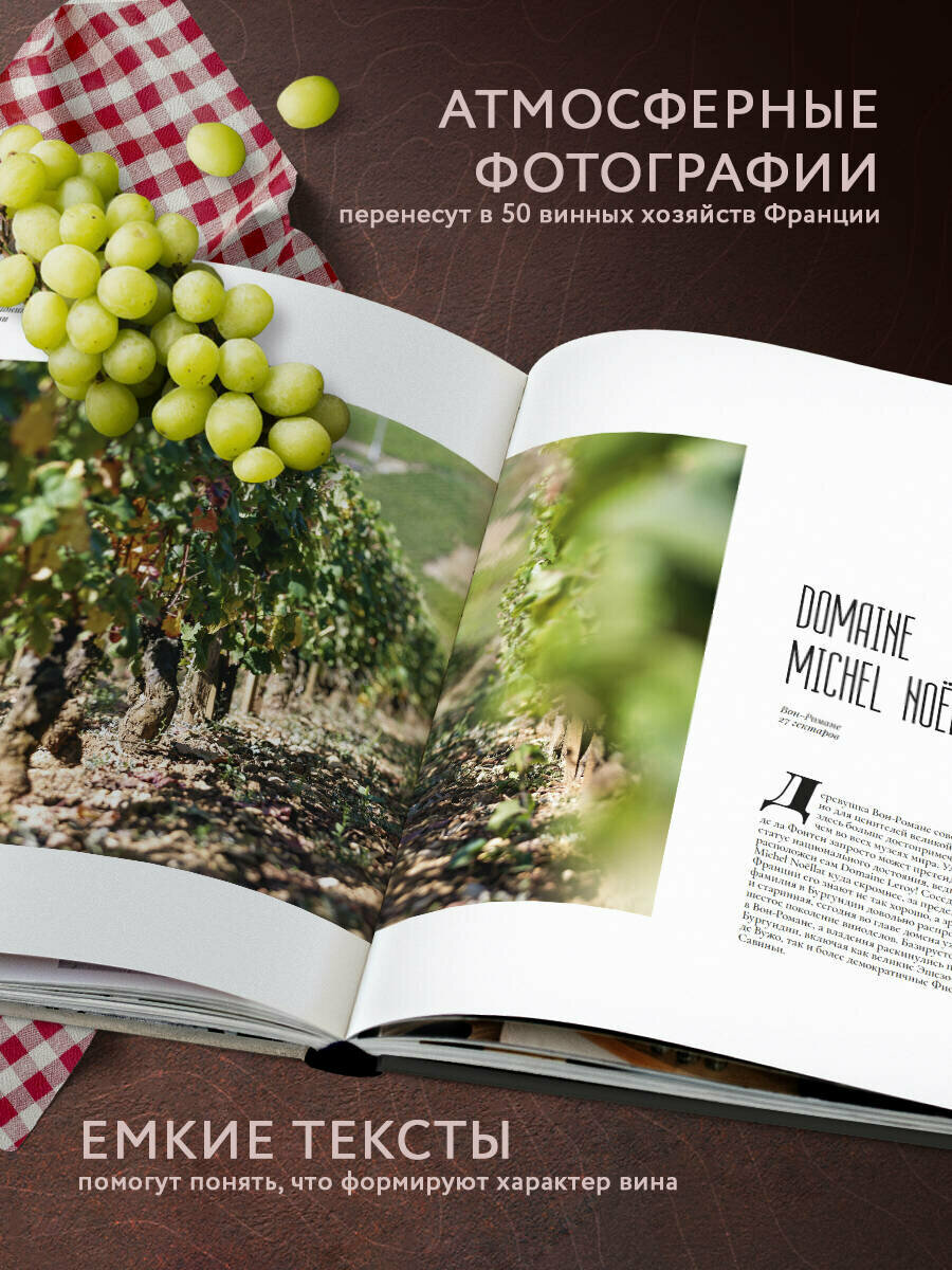 В книге собраны фотографии виноградников и виноделен 50 хозяйств из самых знаковых регионов Франции: Шампани, Бордо и Бургундии. Лаконичные, но ёмкие тексты помогут понять, как особенности той местности, где растёт виноград, формируют уникальный характер вина.