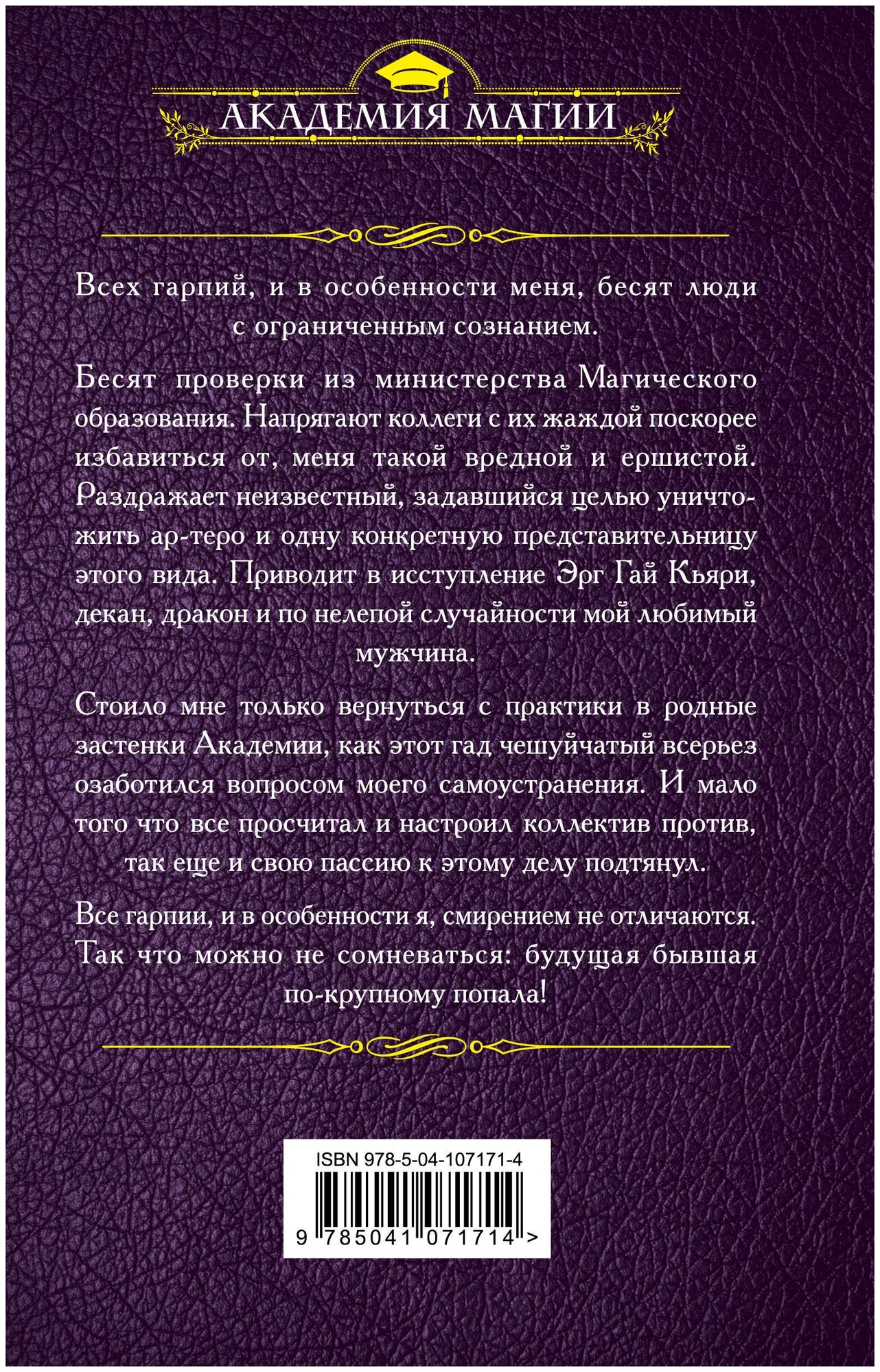 Всех гарпий, и в особенности меня, бесят люди с ограниченным сознанием. Бесят проверки из министерства магического образования. Напрягают коллеги с их жаждой поскорее избавиться от меня такой вредной и ершистой. Раздражает неизвестный, задавшийся целью уничтожить ар-теро и одну конкретную представительницу этого вида. Приводит в исступление Эрг Гай Кьяри, декан, дракон и по нелепой случайности мой любимый мужчина. Стоило мне только вернуться с практики в родные застенки Академии, как этот гад чешуйчатый всерьез озаботился вопросом моего самоустранения. И мало того, что все просчитал и настроил коллектив против, так еще и свою пассию к этому делу подтянул. Все гарпии, и в особенности я, смирением не отличаются. Так что можно не сомневаться: будущая бывшая по-крупному попала!