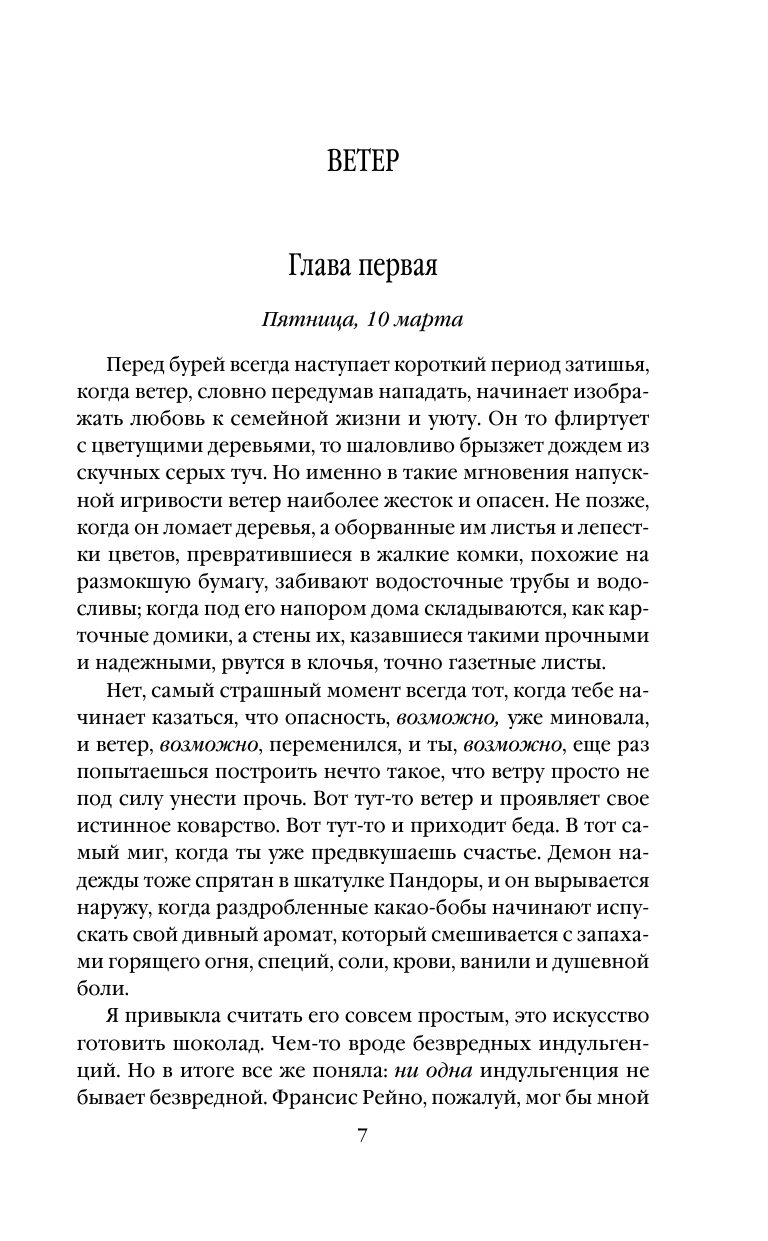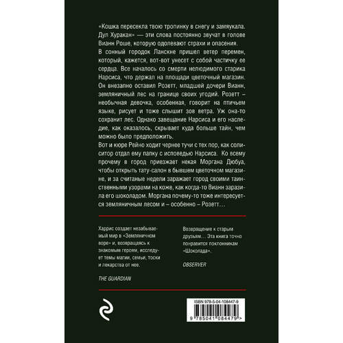 "Кошка пересекла твою тропинку в снегу и замяукала. Дул Хуракан" - эти слова постоянно звучат в голове Вианн Роше, которую одолевают страхи и опасения. В сонный городок Ланскне пришел ветер перемен, который, кажется, вот-вот унесет с собой частичку ее сердца. Все началось со смерти нелюдимого старика Нарсиса, что держал на площади цветочный магазин. Он внезапно оставил Розетт, младшей дочери Вианн, земляничный лес на границе своих угодий. Розетт - необычная девочка, особенная, говорит на птичьем языке, рисует и тоже слышит зов ветра. Уж она-то сохранит лес. Однако завещание Нарсиса и его наследие, как оказалось, скрывает куда больше тайн, чем можно было предположить. Вот и кюре Рейно ходит чернее тучи с тех пор, как солиситор отдал ему папку с исповедью Нарсиса. Ко всему прочему в город приезжает некая Моргана Дюбуа, чтобы открыть тату-салон в бывшем цветочном магазине, и за считанные недели заражает город своими таинственными узорами на коже, как когда-то Вианн заразила его шоколадом. Моргана почему-то тоже интересуется земляничным лесом и - особенно - Розетт…