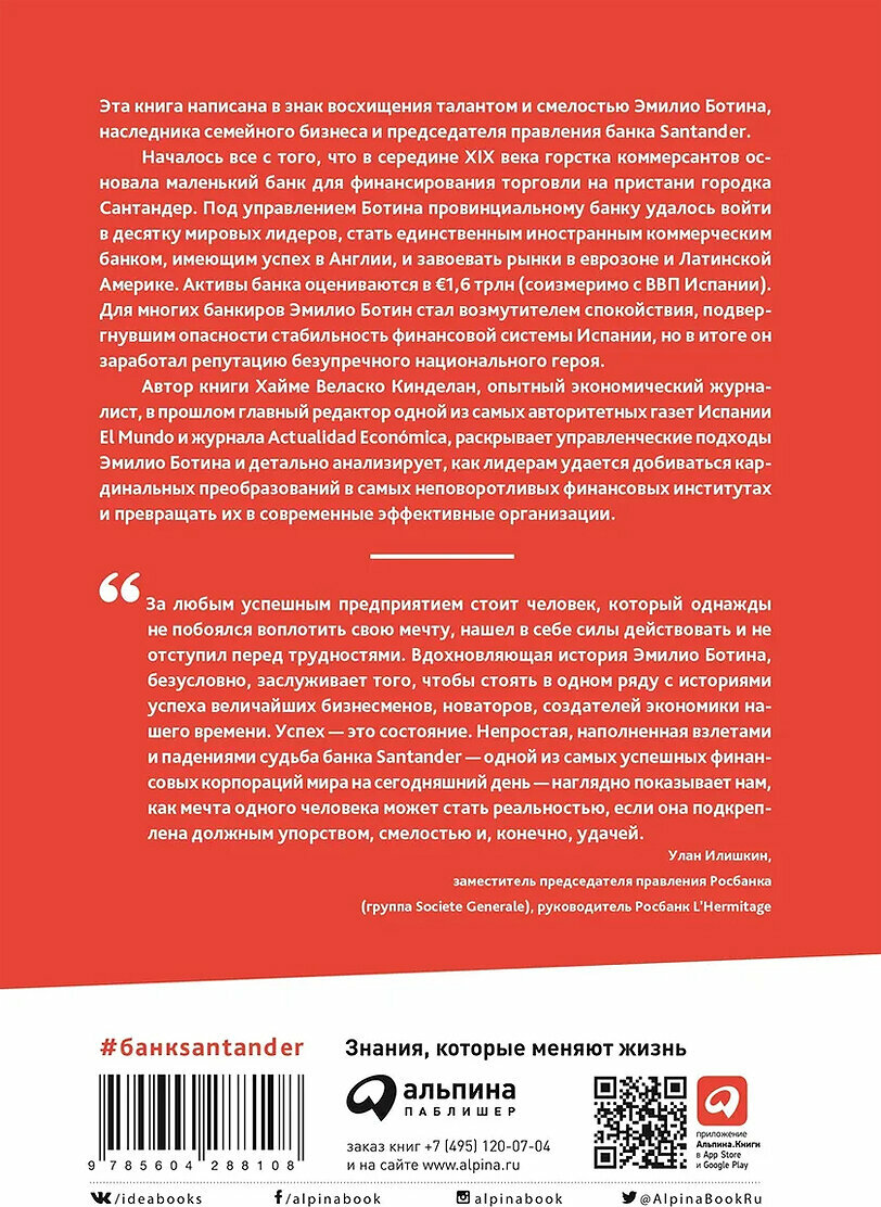 Эта книга рассказывает невероятную историю успеха испанского финансового гиганта Santander, который из маленького провинциального банка, основанного горсткой коммерсантов в середине XIX в. для финансирования торговли на пристани городка Сантандер, превратился в одного из мировых лидеров. В центре повествования — династия Ботин, три представителя которой с начала ХХ в. почти последовательно занимали кресло президента банка. Главная роль отводится Эмилио Ботину III, под управлением которого Santander вырос в мощный финансовый институт с активами, сопоставимыми с ВВП Испании. Для многих банкиров Эмилио Ботин стал возмутителем спокойствия, а в масштабах страны заработал репутацию безупречного национального героя. Автор книги Хайме Веласко Кинделан, опытнейший экономический журналист, искренне восхищается талантом и смелостью Эмилио Ботина. Увлекательно и с глубоким погружением в тему он рассказывает об управленческих подходах Ботинов, кардинальных преобразованиях, изменивших банковский сектор, и истинно испанских перипетиях семейного бизнеса.