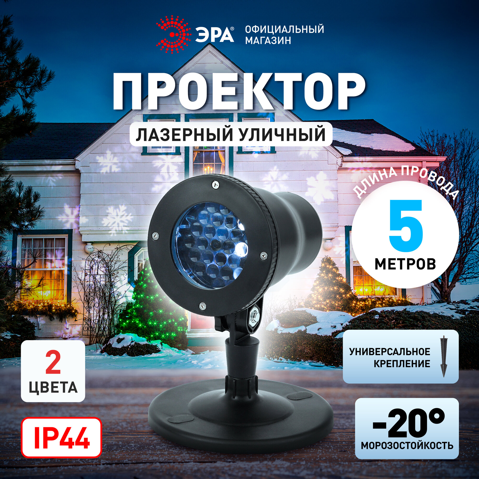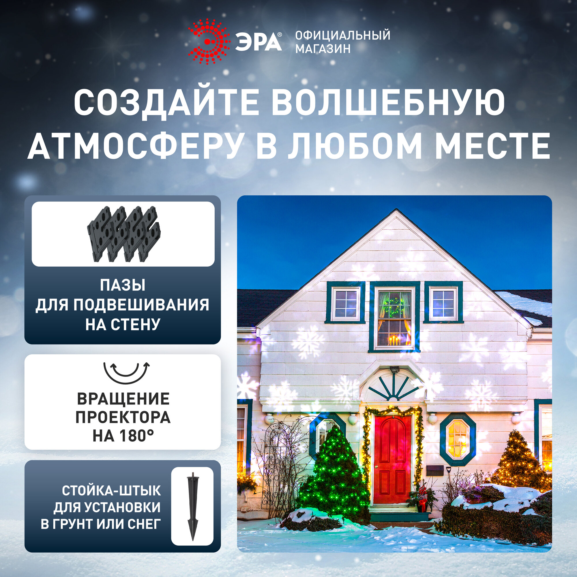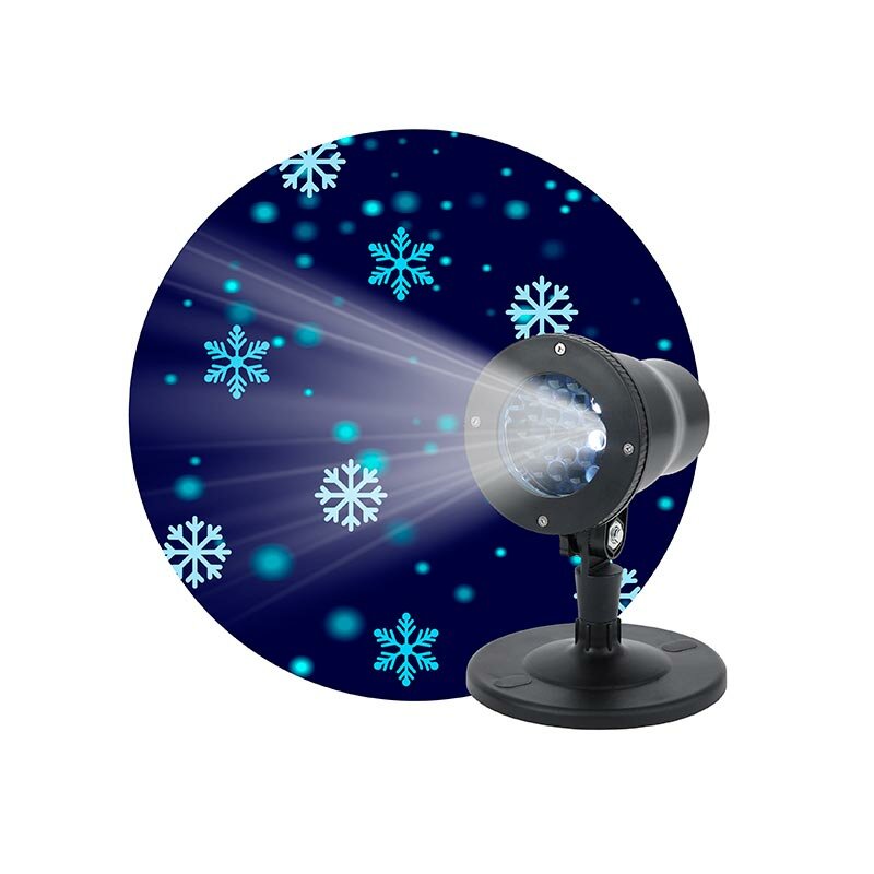 Проектор «Эра» «Снежинки» поможет красиво подсветить фасад здания или стены комнаты, создавая праздничную атмосферу. Корпус проектора изготовлен из пластика. Конструкция поворотная. Источник света — встроенные светодиоды, которые экономно расходуют энергию, долго служат. Цвета проекции — белый и голубой.