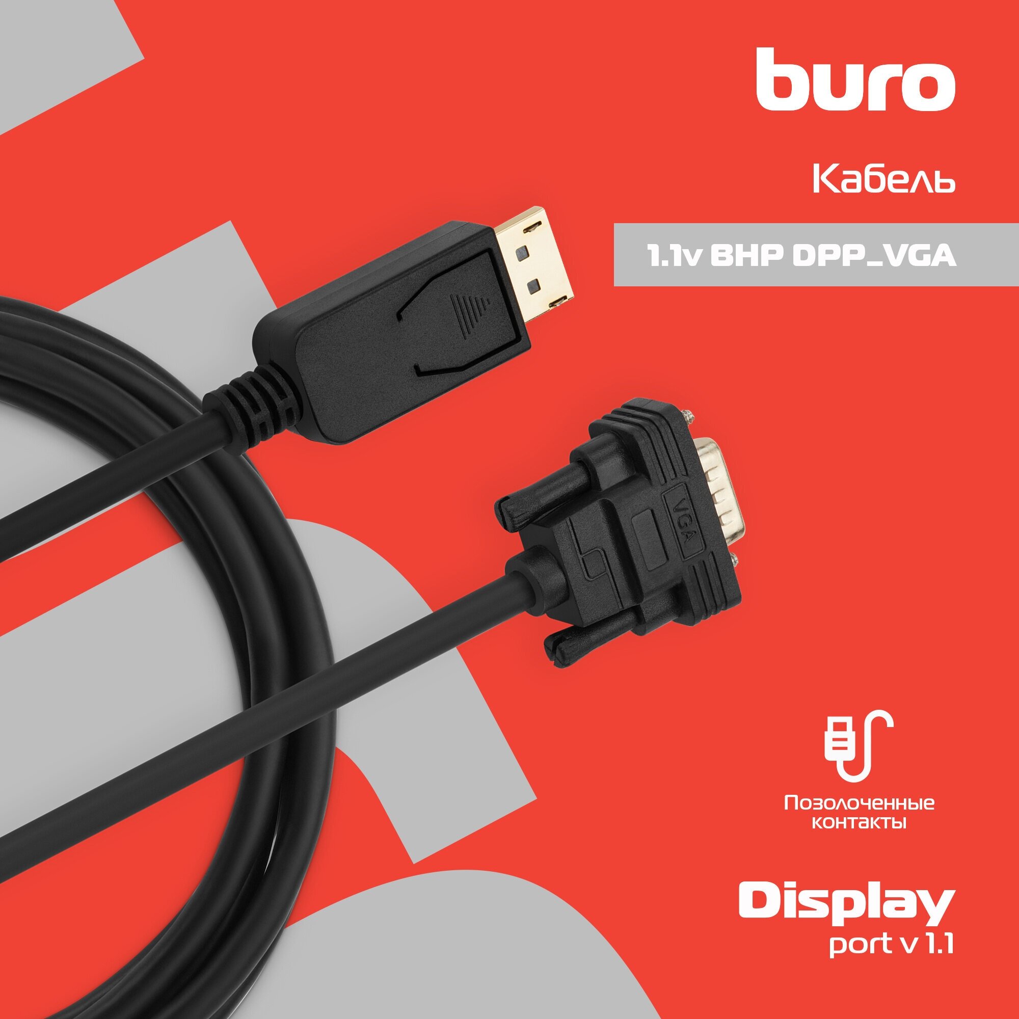 Кабель Display Port Buro 1.1v, коннекторы DisplayPort (m)/VGA (m), длина 2м., Позолоченные контакты (BHP DPP_VGA-2)