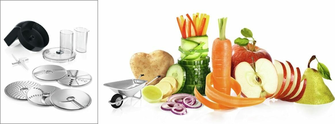 Также в комплекте имеются специальные диски для нарезки ломтиками и шинковки, которые значительно упростят подготовку овощей и фруктов для дальнейшего использования в кулинарии.