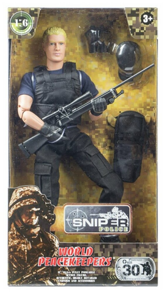 Фигурка солдата Снайпера в специальной амуниции выполнена в масштабе 1:6, высота 30,5 см, имеет 30 точек артикуляции. Такие фигурки обладают уникальной детализацией: настоящие карманы на одежде, цепочки с кулоном на шее, бронежилет на липучках, ширинка на пуговицах и др. В комплекте военное оружие и дополнительные тематические аксессуары. В ассортименте 4 вида солдат.