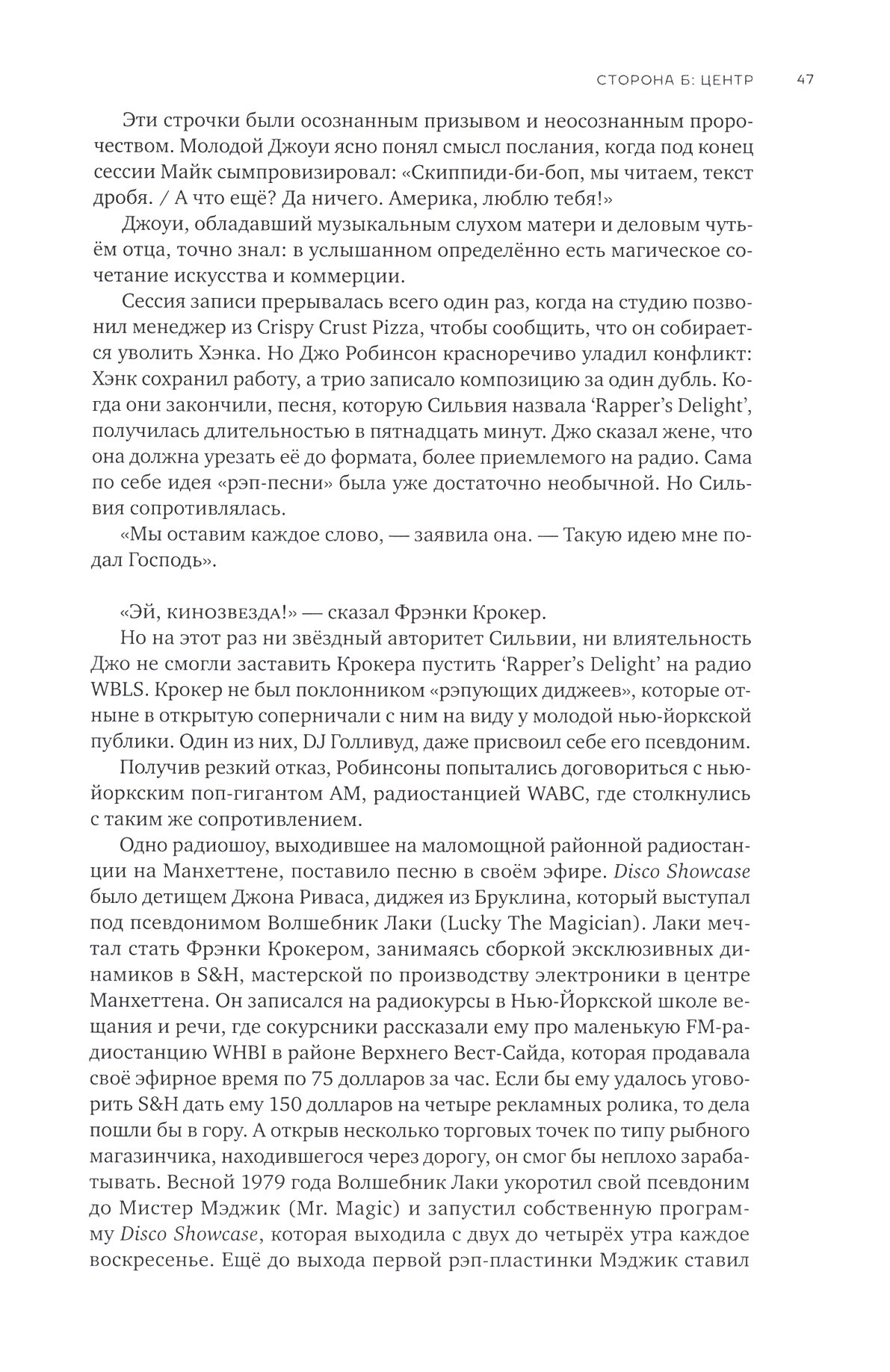 Дэн Чарнас представляет полномасштабную историю зарождения, развития и триумфа такого культурного, политического и экономического феномена, как хип-хоп. Эта книга про то, как маргинальная городская субкультура конца 1970-х годов за тридцать лет не только смогла стать уникальным средством творческого самовыражения нового поколения, не только сумела породить многомиллиардный бизнес, выйдя за рамки индустрии развлечений в сферу потребительских товаров и услуг, но и изменила американское общество, кардинально трансформировав расовую динамику США, что позволило осуществиться избранию первого чернокожего президента страны. Общество, в свою очередь, тоже преобразило хип-хоп, обусловив как сильные его стороны, так и изъяны. Об их взаимном влиянии, о творческой, идеологической и коммерческой эволюции хип-хопа автор (журналист, стипендиат Пулитцеровской премии и бывший сотрудник нескольких звукозаписывающих лейблов, сыгравших свою роль в становлении хип-хопа) рассказывает детально и обстоятельно, выстраивая свой сюжет на внушительном документальном материале: триста с лишним персональных интервью, судопроизводственные акты, переписка, контракты, газетные и журнальные статьи, радио- и ТВ-архивы, фотографии, фильмы, сайты.