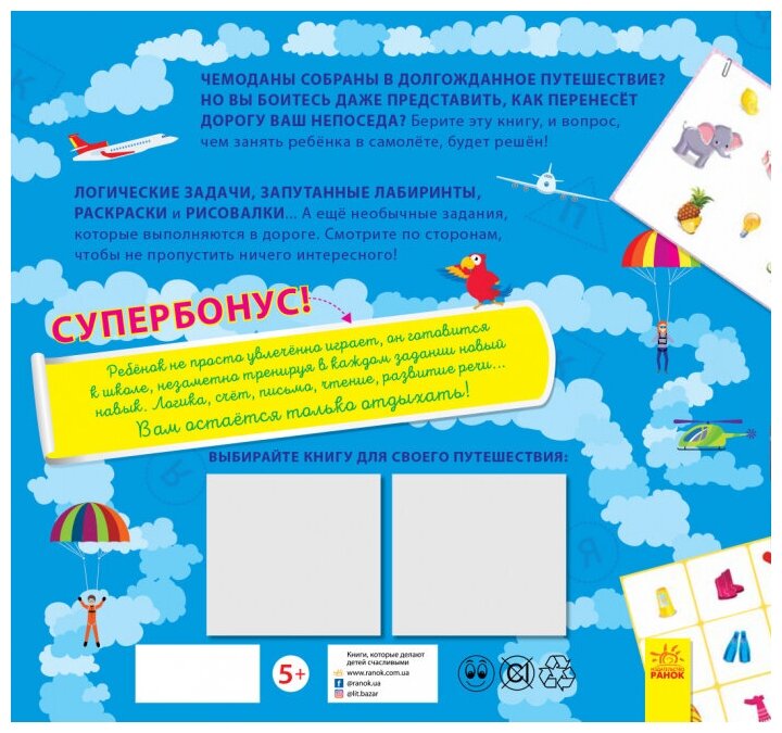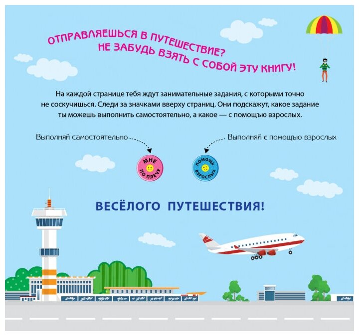 Отправляетесь в путешествие? Не забудьте взять с собой эту книгу! На каждой странице вы найдете занимательные задания, с которыми точно не соскучитесь. Следите за значками вверху страниц. Они подскажут, какое задание вы можете выполнить самостоятельно, а какое - с помощью взрослых. Веселого путешествия!