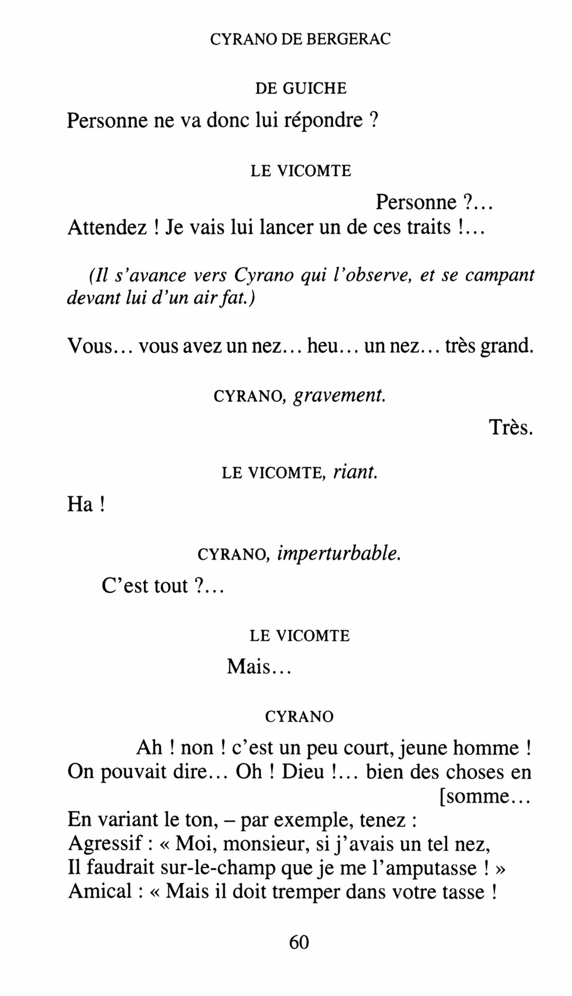 Savant fou tombe de la Lune ou ferrailleur eblouissant, si tous se reconnaissent en lui, s'il nous arrache des larmes, c'est parce qu'il est d'une profonde verite humaine. C'est lui que Roxane aimait, son intelligence, son esprit. Cyrano est une part de nous-meme, le vengeur des humilies et des offenses, des timides et des rates de l'amour. A la fin de l'envoi, c'est toujours lui qui gagne.