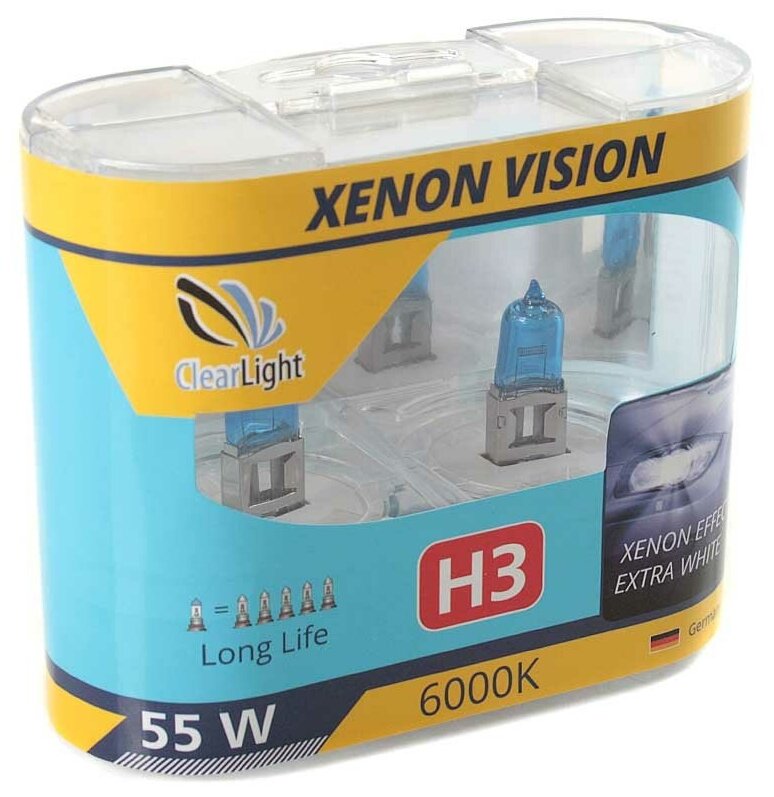 Галогеновая лампа Clearlight XenonVision предлагается автолюбителю комплектом из двух изделий, позволяющим снабдить лампами две автомобильные фары. Эти надежные и долговечные лампы укомплектованы цоколями типа Н10 и подходят для монтажа как в фары головного света, так и в противотуманные фары. Создаваемый ими интенсивный теплый белый свет с голубоватым оттенком отличается мягкостью и не режет глаза водителям встречных авто, уверенно освещая дорогу в любых погодных условиях.Лампы типа Clearlight XenonVision с эффектом ксенона порадуют автолюбителей своими эксплуатационными свойствами, оставаясь доступными по цене.