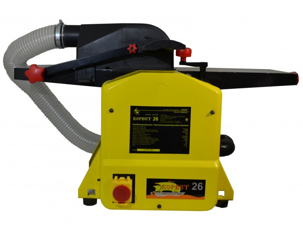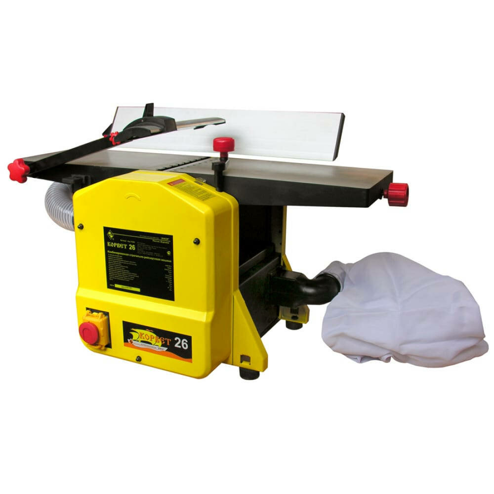 Станок строгально-фуговальный комбинированный Корвет 26 применяется при обработке черновых заготовок из древесины. По своей сути данный станок состоит из 2 станков, является 2 в одном, так как на нем можно выполнять две операции поочередно: рейсмусование (строгание заготовки в заданный размер с одной стороны) и фугование (придание заготовке ровной поверхности с одной стороны). Станок имеет асинхронный двигатель мощностью 1500 Вт, а ременной привод обеспечивает его защиту от перегрузок, понижает шум, магнитный пускатель не допускает самопроизвольного запуска станка. Рабочие столы имеет достаточно большую длину и выполнены из отшлифованного чугуна, что обеспечивает качество обработки, так же на станке установлена направляющая планка, имеющая наклон до 45 градусов. Имеющиеся 2 рабочих положения патрубка пылесборника обеспечат чистоту при работе, а встроенная турбина для сбора стружки обеспечит работы станка без пылесоса. Станок оснащен автоматической подачей заготовки, со скоростью до 8 м в минуту. Для безопасности при работе на станке рабочий вал имеет защитную планку.