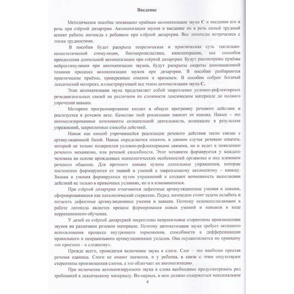 Методическое пособие посвящено приемам автоматизации звука С и введению его в речь при стертой дизартрии. Раскрыта теоретическая и практическая суть приемов нейростимуляции, как способов преодоления длительной автоматизации при стертой дизартрии. Предложен лексический, игровой материал, иллюстрирующий все этапы автоматизации звука С (11 модулей).
