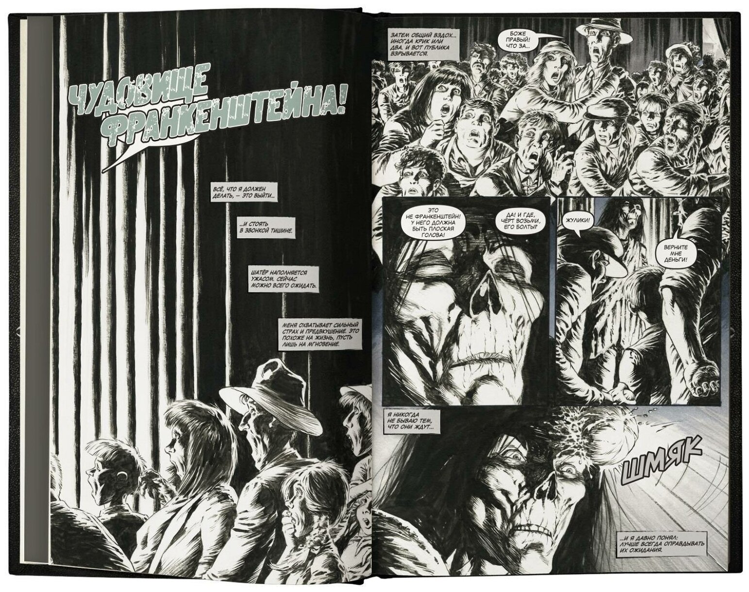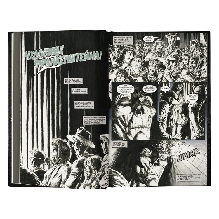 Из ста с небольшим страниц этого издания, собственно на комикс (все его четыре части/главы) приходится страничек семьдесят. Почти четверть объема занимают дополнительные материалы, содержащие наброски и комментарии к ним. Качество самого издания – хорошее. Бумага даже показалась плотнее, чем в муровской "Лиге" от того, же, АСТ. Формата, кстати, они одинакового. Сама графика "Франкенштейна" – практически монохромная. Изредка встречаются оттенки сине-голубого цвета. Выглядит комикс стильно, жаль объема небольшого.