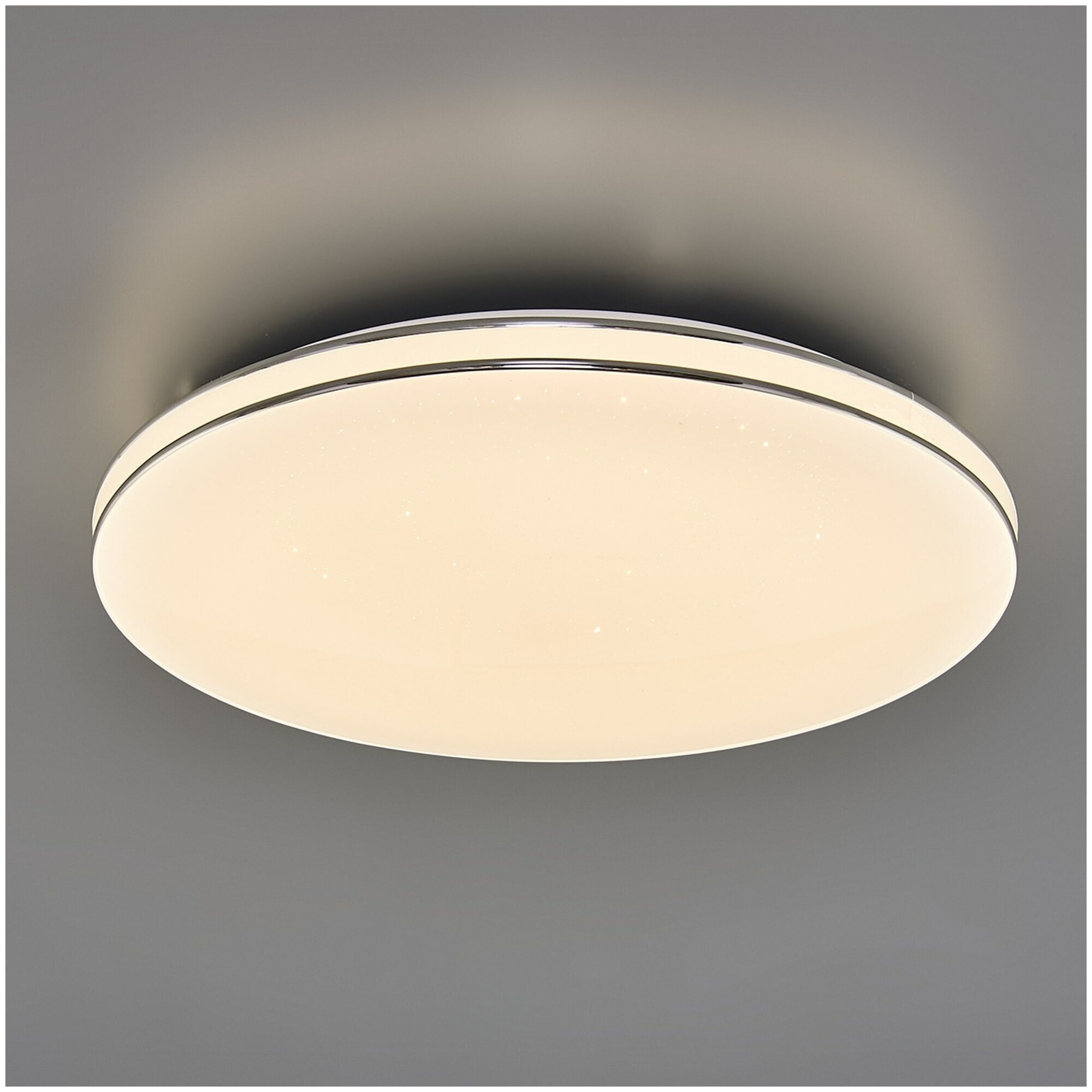 Конструкция из металла и акрила является надежной, обеспечивает светильнику практичность и долгий срок службы. Рассеиватель украшен прозрачными точками, которые при включенном свете превращаются в маленькие звездочки, создающие на стенах и потолке красивые переливы. Источником света в данной модели выступает LED-модуль мощностью 72 Вт. В комплекте со светильником идет пульт ДУ, который позволяет менять цветовую температуру с холодной на теплую (3000 К - 6000 К).