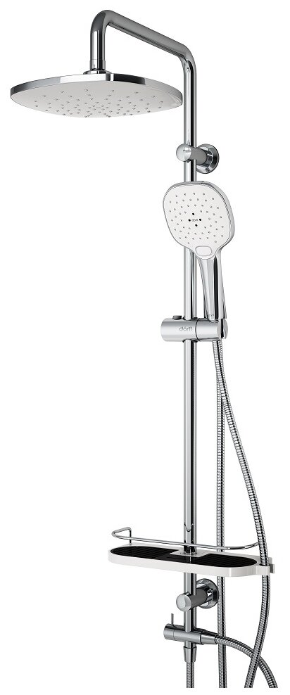 | Комплектация | Душевой шланг, душевая лейка, душевая стойка, верхний душ, держатель для душа, настенный держатель, полочка, крепления, инструкция |