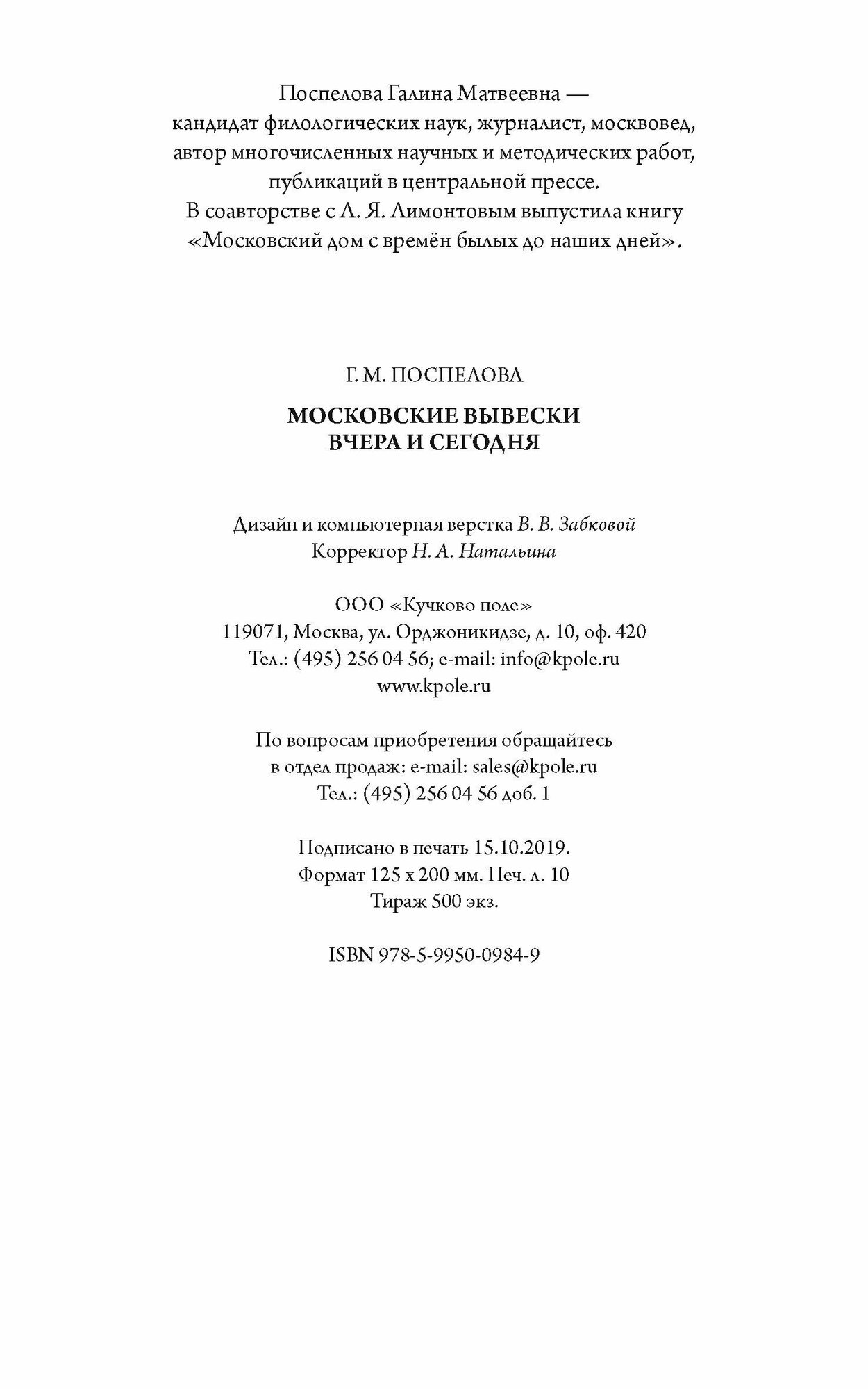 Книга документальных рассказов Г. М. Поспеловой посвящена московским вывескам, на протяжении веков являвшихся неизменной частью уличного пространства и во многом определявших облик города. Читатель познакомится со спецификой вывесочной информации в дореволюционной Москве, узнает об изменениях в вывесочном словаре после 1917 года, о содержании советских вывесок в предвоенный период и послевоенное время, в трудные 1990-е. Значительную часть книги составляют главы, раскрывающие панораму жизни современной вывески.