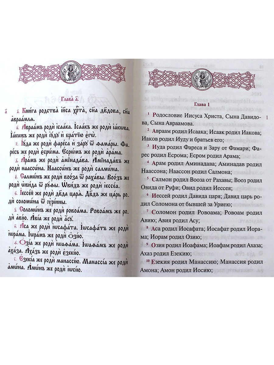 Святое Евангелие на церковнославянском языке сопровождается параллельным русским синодальным переводом. Это дает возможность глубже понять смысл Писания и облегчает восприятие церковнославянского текста. Сопровождение текста параллельными местами и удобный для чтения шрифт облегчат изучение Священного Писания, а благородное оформление и качественная печать позволяют изданию занять достойное место в любой библиотеке.