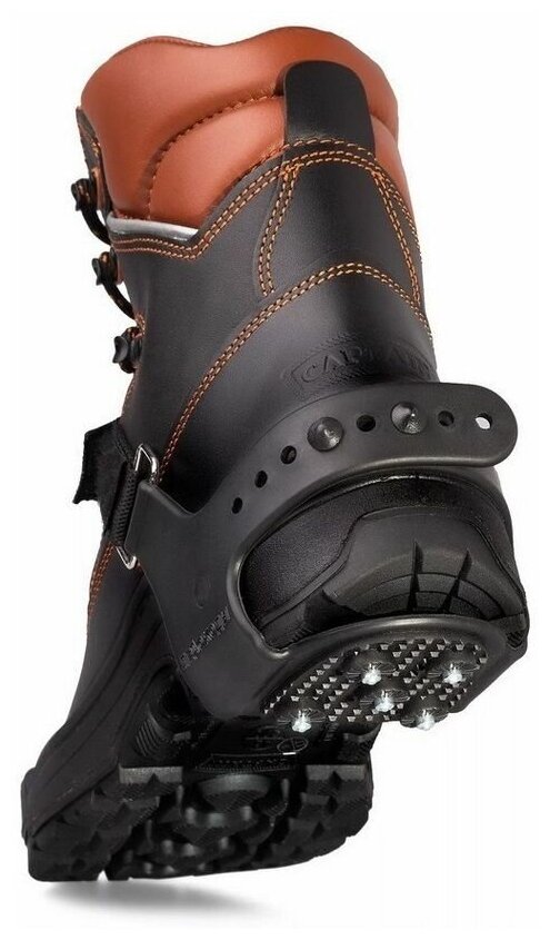 Комплект состоит из 2-х отдельных элементов – для передней части стопы и пятки. На каждой расположено по 5 металлических шипов. Последние долго сохраняют остроту и не деформируются, поэтому даже при ежедневном использовании обеспечивают хорошее сцепление с обледенелой дорогой. За крепкую фиксацию на сапогах отвечают застежки на ремешках, которые легко регулируются.