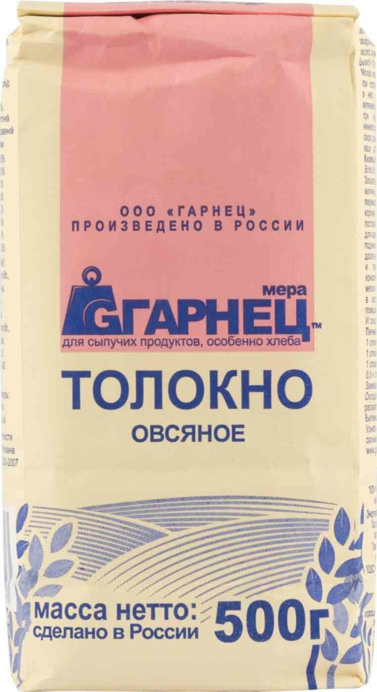 Толокно Гарнец овсяное 500 г - это высококачественное толокно, произведенное ООО "Гарнец" в соответствии со стандартом ГОСТ 2929-75.