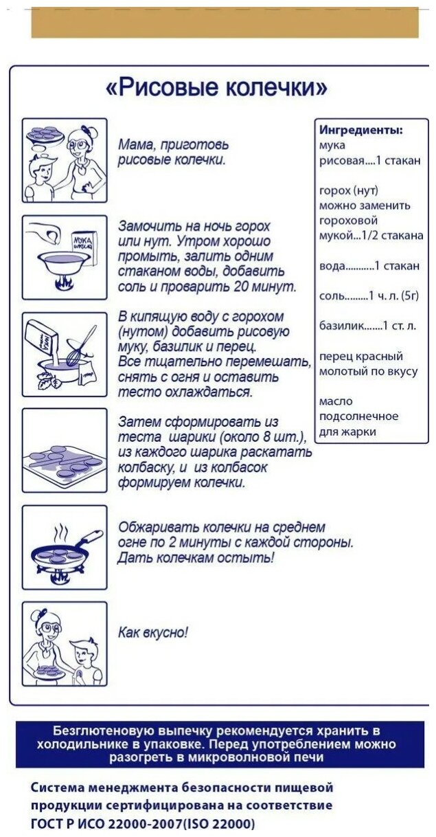 Описание товара:Мука рисовая цельнозерновая Garnec 500 г. Наша безглютеновая продукция производится в отдельном помещении на специально предназначенном для этого оборудовании. Отсутствие глютена контролируется как на производстве так и в аккредитованной лаборатории в соответствии с международными стандартами.Состав товара:Мука рисовая.Способ приготовления:Рисовые колечки. Ингредиенты: мука рисовая - 1 стакан, горох (нут) можно заменить гороховой мукой - 1/2 стакана, вода - 1 стакан, соль 1 чайная ложка (5 г), базилик - 1 ст. л., перец красный молотый - по вкусу, масло подсолнечное для жарки. Замочить на ночь горох или нут. Утром хорошо промыть, залить одним стаканом воды, добавить соль и проварить 20 минут. В кипящую воду с горохом (нутом) добавить рисовую муку, базилик и перец. Всё тщательно перемешать, снять с огня и оставить тесто охлаждаться. Затем сформировать из теста шарики (около 8 шт.), из каждого шарика раскатать колбаску, и из колбасок формируем колечки. Обжаривать колечки на среднем огне по 2 минуты с каждой стороны. Дать колечкам остыть!Меры предосторожности:Хранить в чистом, сухом, хорошо проветриваемом помещении.