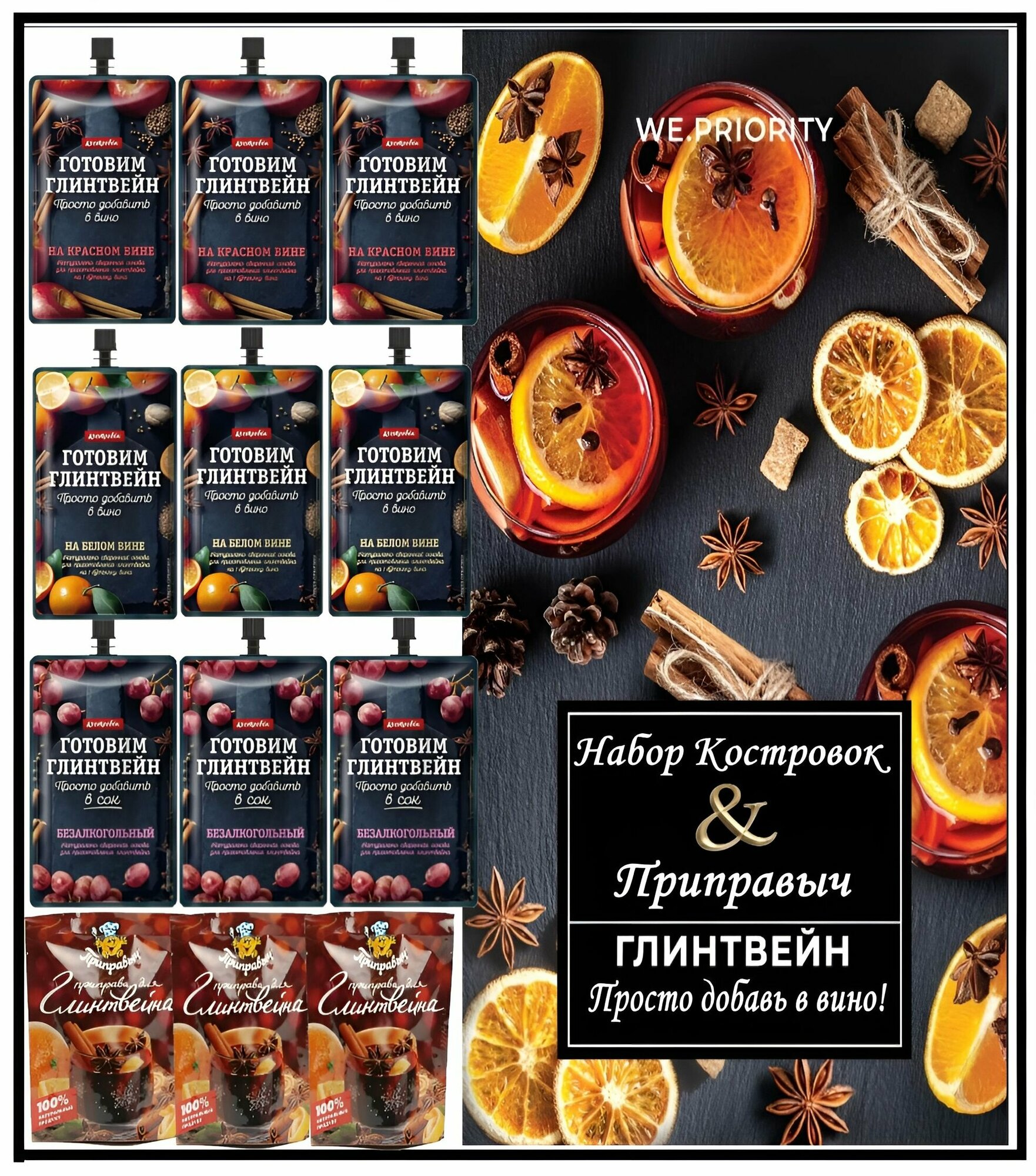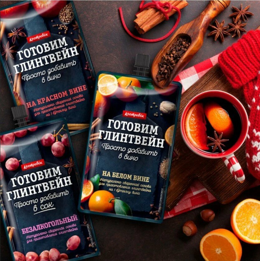 Глинтвейн – это горячий алкогольный напиток на основе сухого или полусухого красного вина, нагретого до 70-80 градусов, с добавлением сахара, пряностей, лимонной цедры, фруктов, а порой даже орехов. На основе отвара из фруктовых и ягодных соков со специями и пряностями. С основой глинтвейн готовить легко – просто добавить основу в подогретое вино или сок. На обратной стороне имеется рецепт его приготовления. Глинтвейн можно приготовить из яблочного, вишнёвого, виноградного соков. Упаковка основы рассчитана на 1 бутылку вина. Состав набора:1. Основа для приготовления Глинтвейна на красном вине Костровок 3шт х 100г2. Основа для приготовления Глинтвейна безалкогольного Костровок 3шт х 100г3. Основа для приготовления Глинтвейна на белом вине Костровок 3шт х 100г4. Приправа для Глинтвейна Приправыч 3шт х 40г