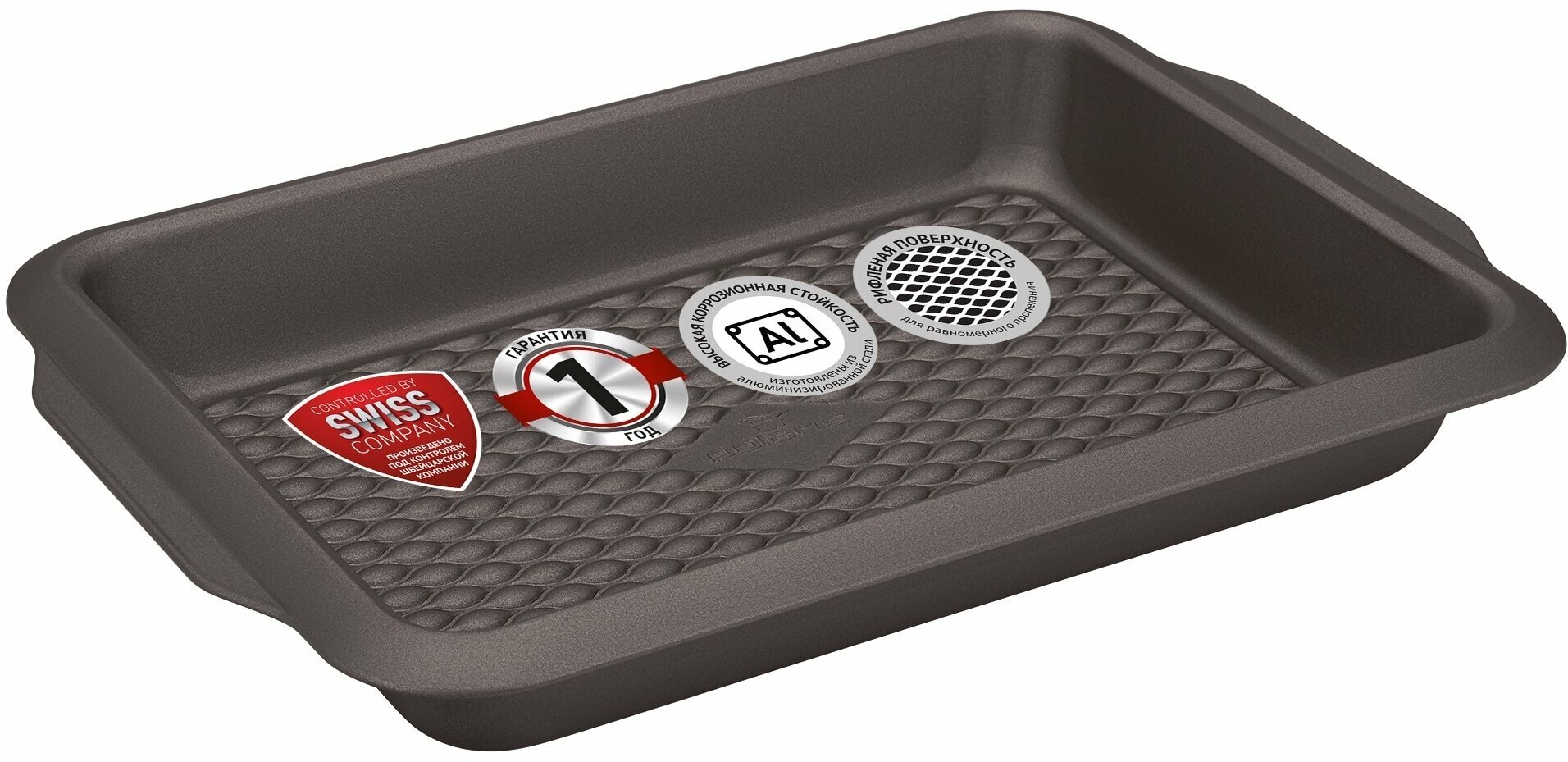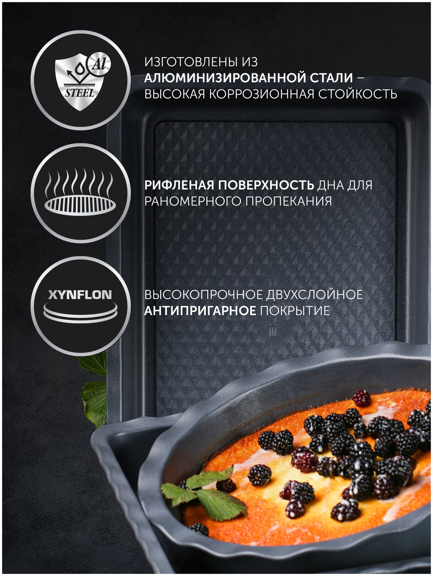 Форма изготовлена из экологичного материала - АЛЮМИНИЗИРОВАННАЯ СТАЛЬ. Высокопрочное двухслойное антипригарное покрытие Xynflon предотвращает прилипание и пригорание продуктов в процессе приготовления. Рифленая поверхность дна для равномерного пропекания.